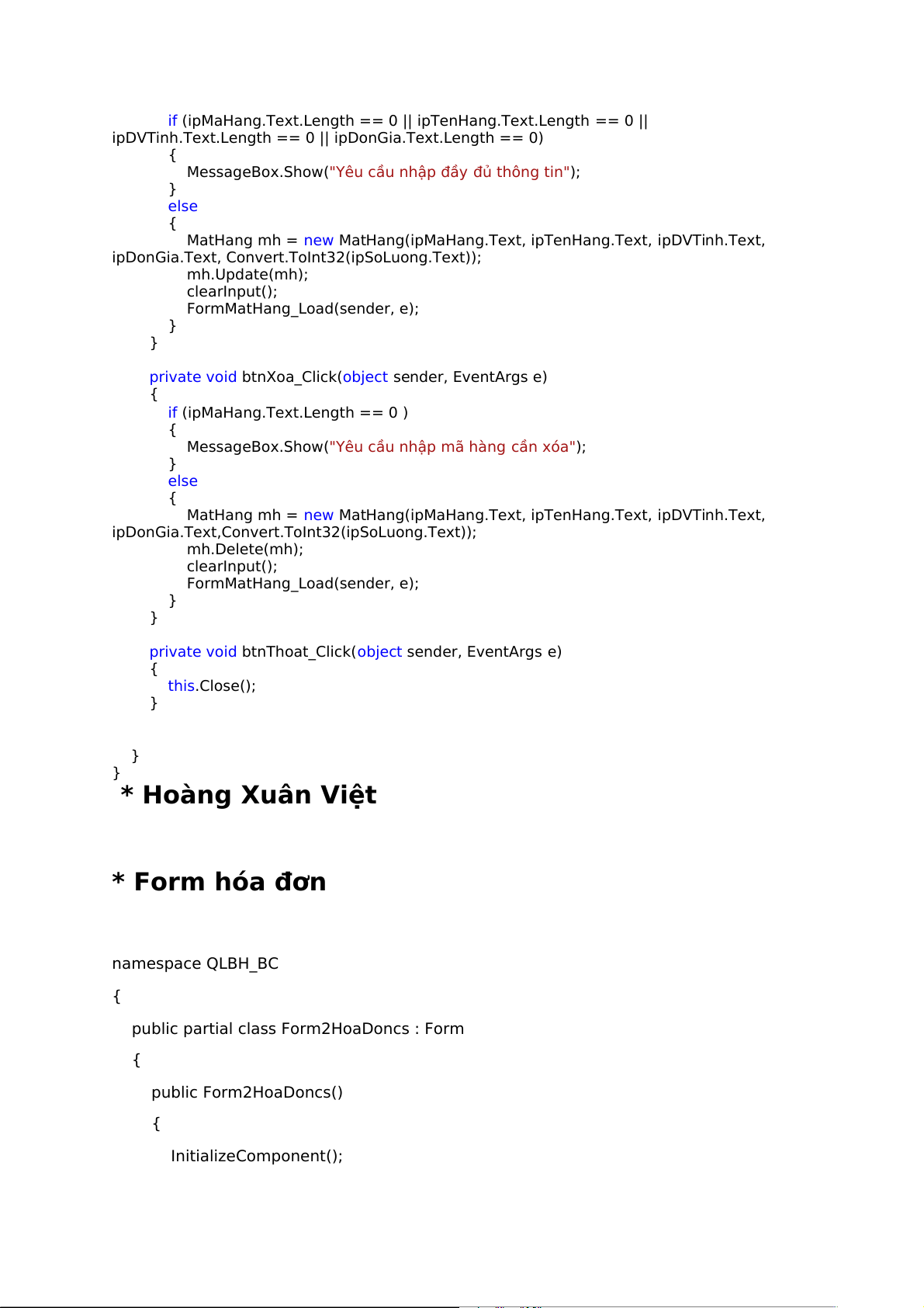 private void btnThoat_Click(object sender, EventArgs e) { this.Close(); } } } * Hoàng Xuân Việt * Form hóa đơn namespace QLBH_BC {