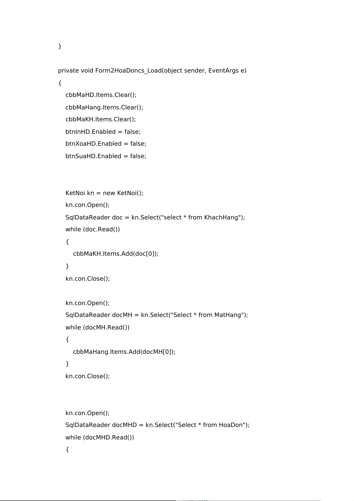 private void Form2HoaDoncs_Load(object sender, EventArgs e) { cbbMaHD.Items.Clear(); cbbMaHang.Items.Clear(); cbbMaKH.Items.Clear(); btnInHD.Enabled = false; btnXoaHD.Enabled = false; btnSuaHD.Enabled = false; KetNoi kn = new KetNoi(); kn.con.Open();