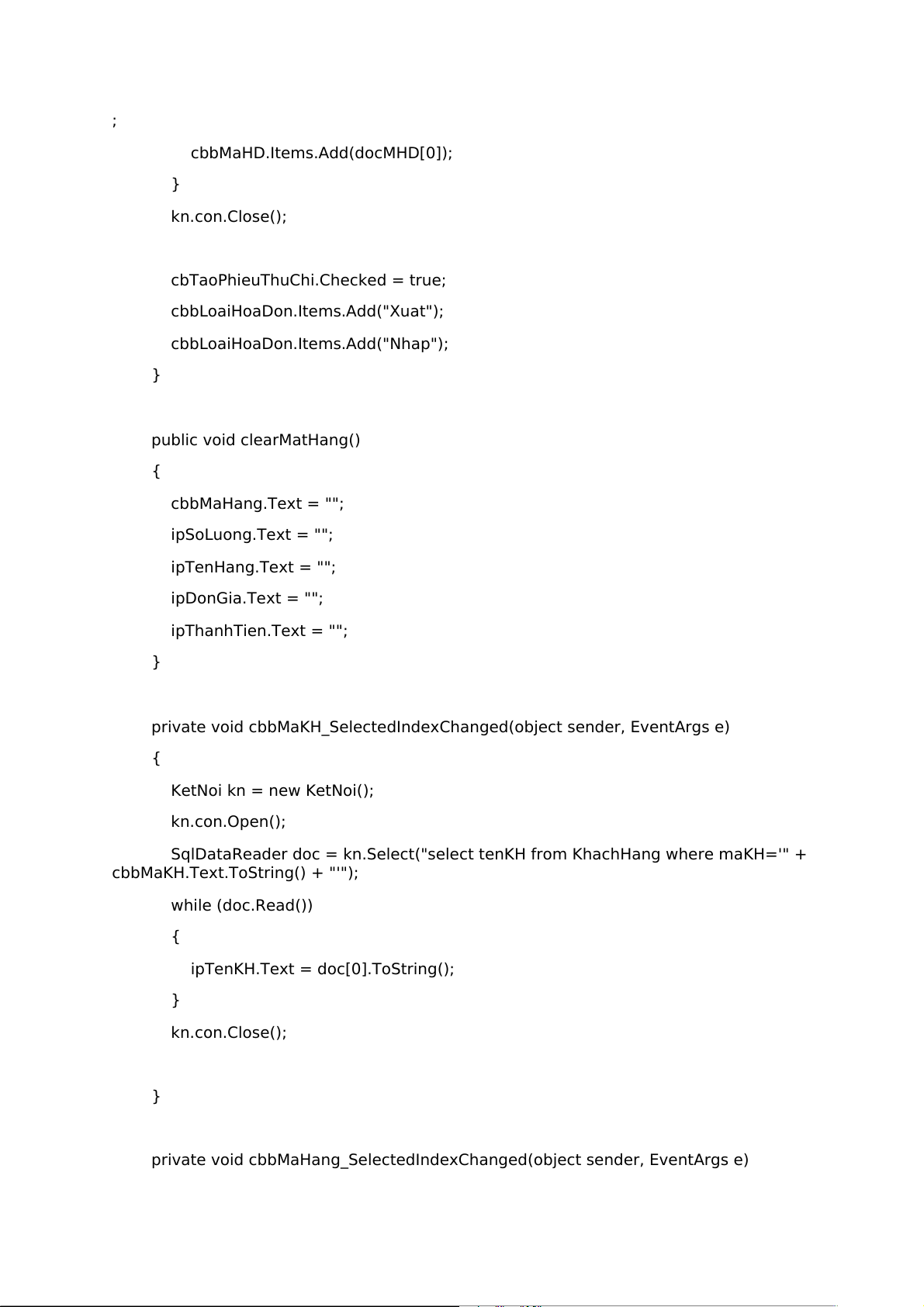 cbbLoaiHoaDon.Items.Add("Nhap"); } public void clearMatHang() { cbbMaHang.Text = ""; ipSoLuong.Text = ""; ipTenHang.Text = ""; ipDonGia.Text = ""; ipThanhTien.Text = ""; }