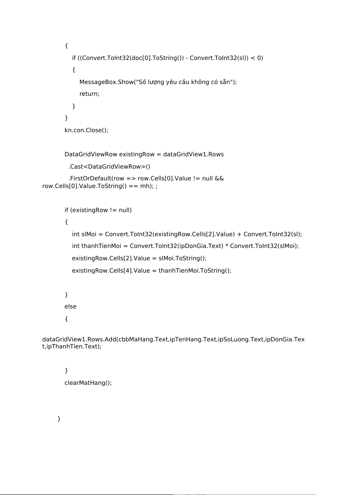 dataGridView1.Rows.Add(cbbMaHang.Text,ipTenHang.Text,ipSoLuong.Text,ipDonGia.Tex t,ipThanhTien.Text); } clearMatHang(); }