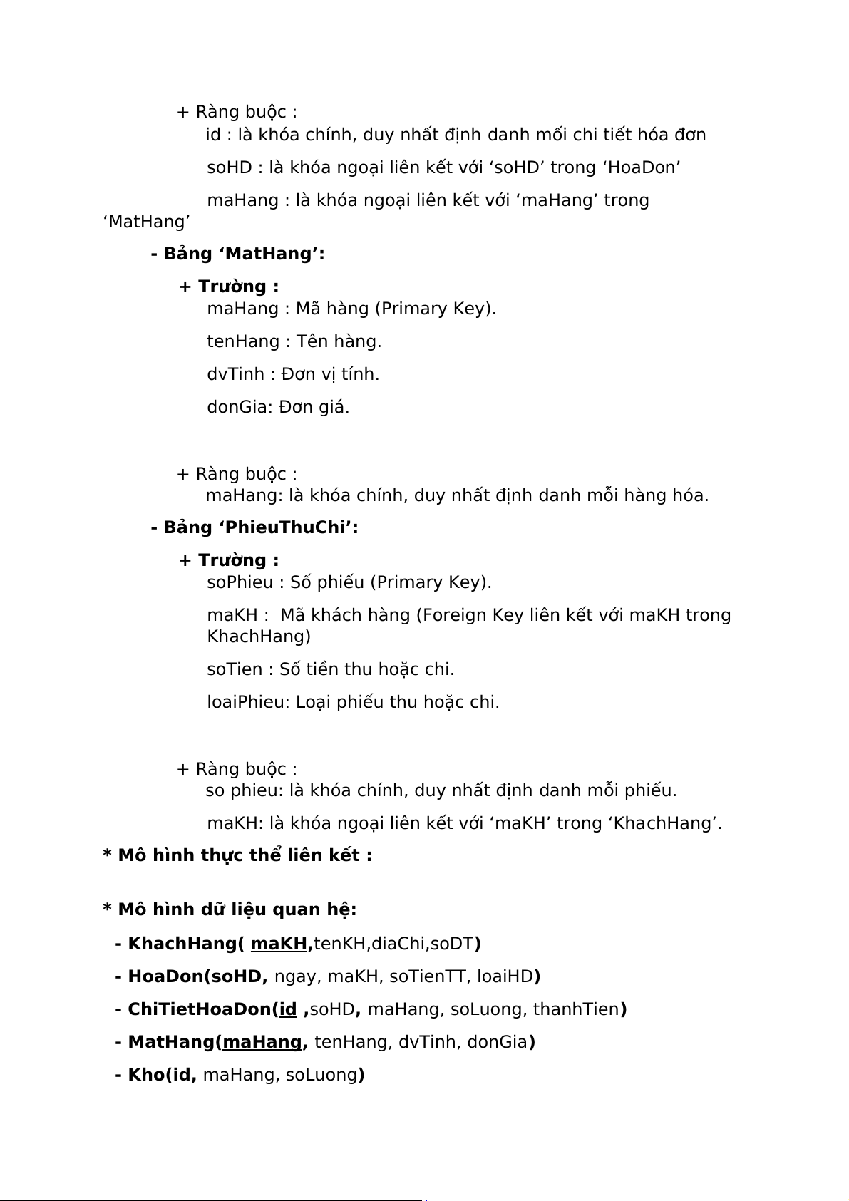 - KhachHang( maKH,tenKH,diaChi,soDT) - HoaDon(soHD, ngay, maKH, soTienTT, loaiHD )