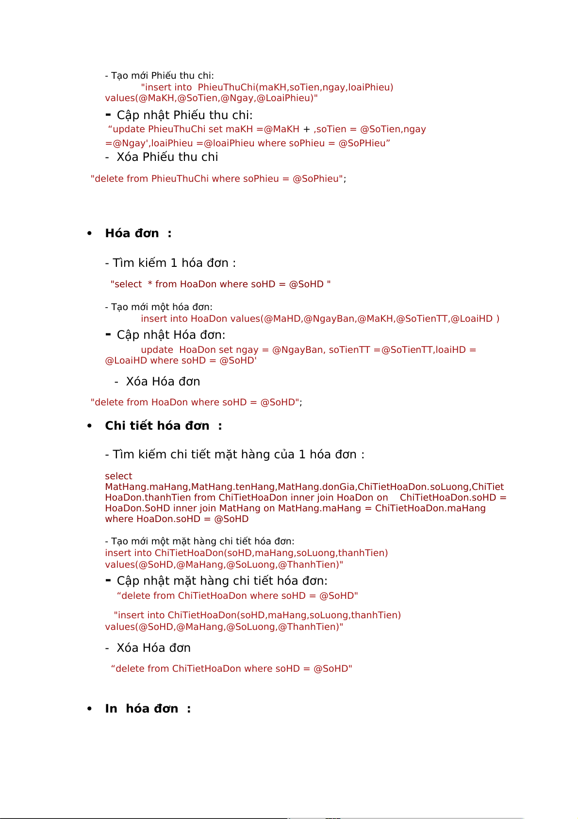“delete from ChiTietHoaDon where soHD = @SoHD" In hóa đơn :