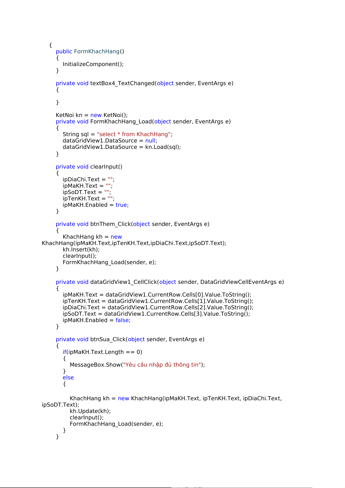 dataGridView1.DataSource = kn.Load(sql); } private void clearInput() { ipDiaChi.Text = ""; ipMaKH.Text = ""; ipSoDT.Text = ""; ipTenKH.Text = ""; ipMaKH.Enabled = true; }