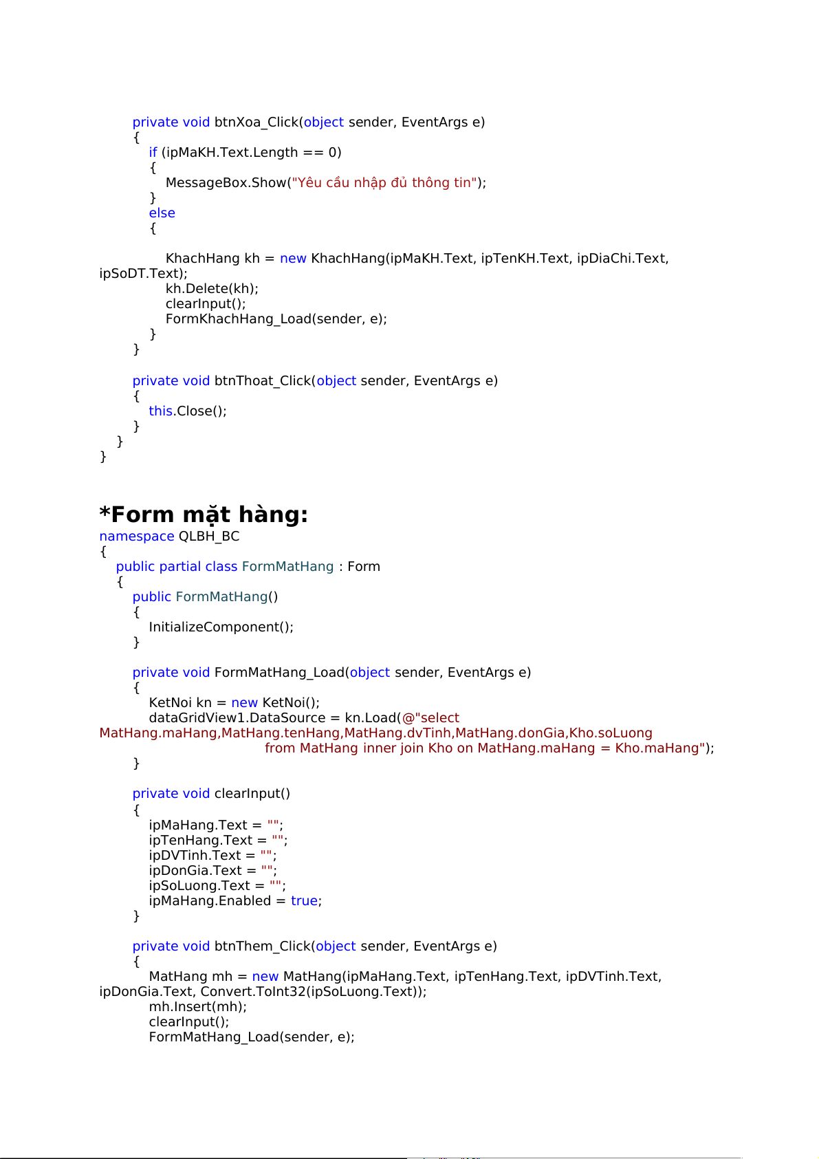 private void btnThoat_Click(object sender, EventArgs e) { this.Close(); } } } *Form mặt hàng: namespace QLBH_BC {