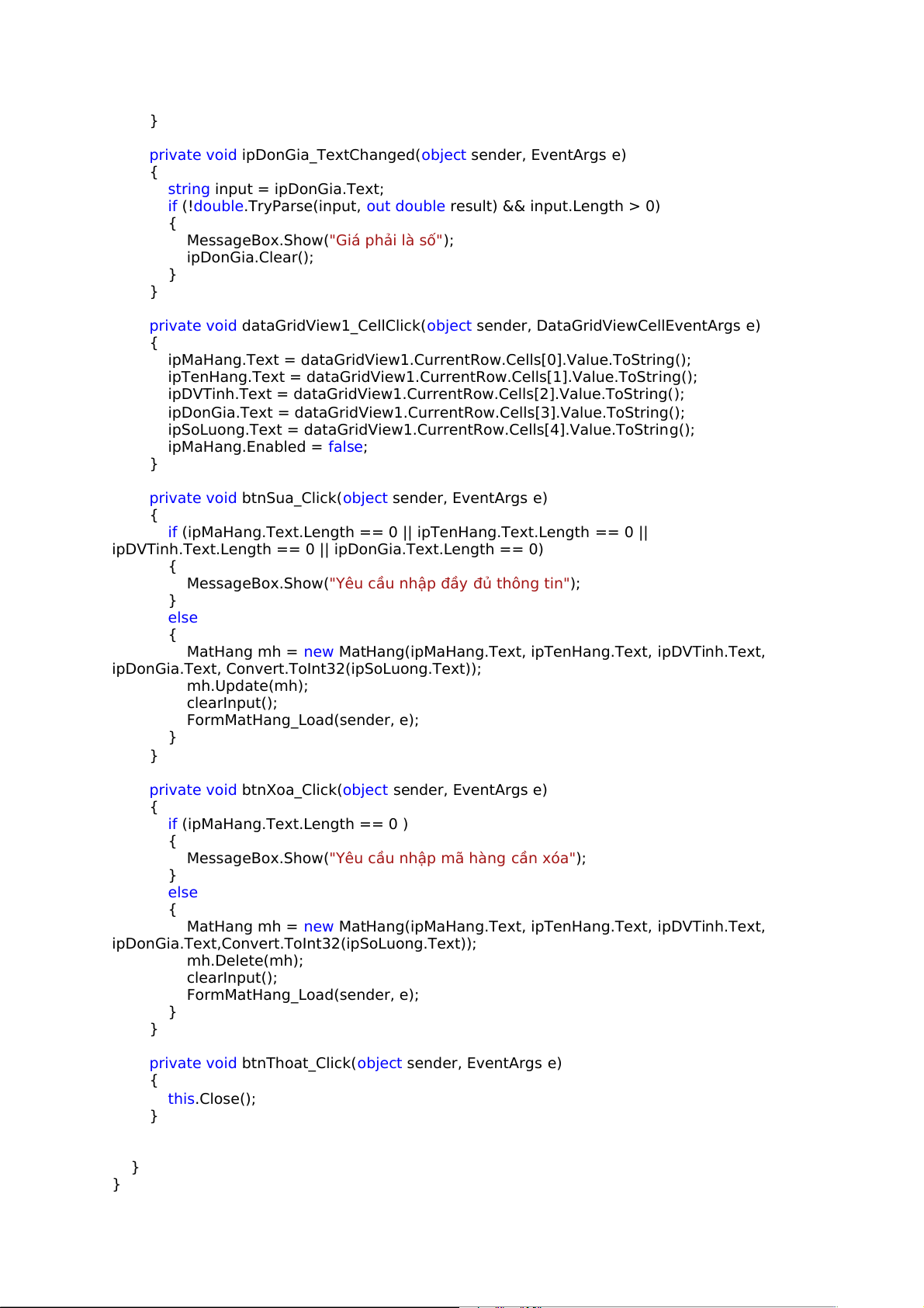 ipDonGia.Text, Convert.ToInt32(ipSoLuong.Text)); mh.Update(mh); clearInput(); FormMatHang_Load(sender, e); } }
