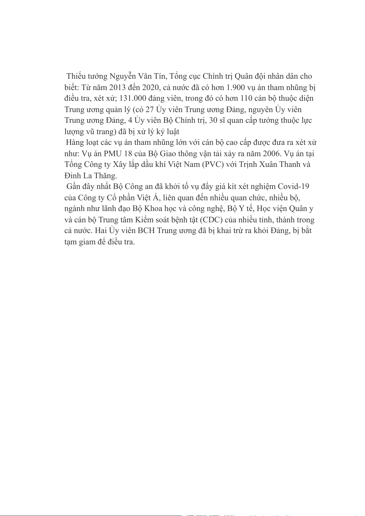 điều tra, xét xử; 131.000 đảng viên, trong đó có hơn 110 cán bộ thuộc diện