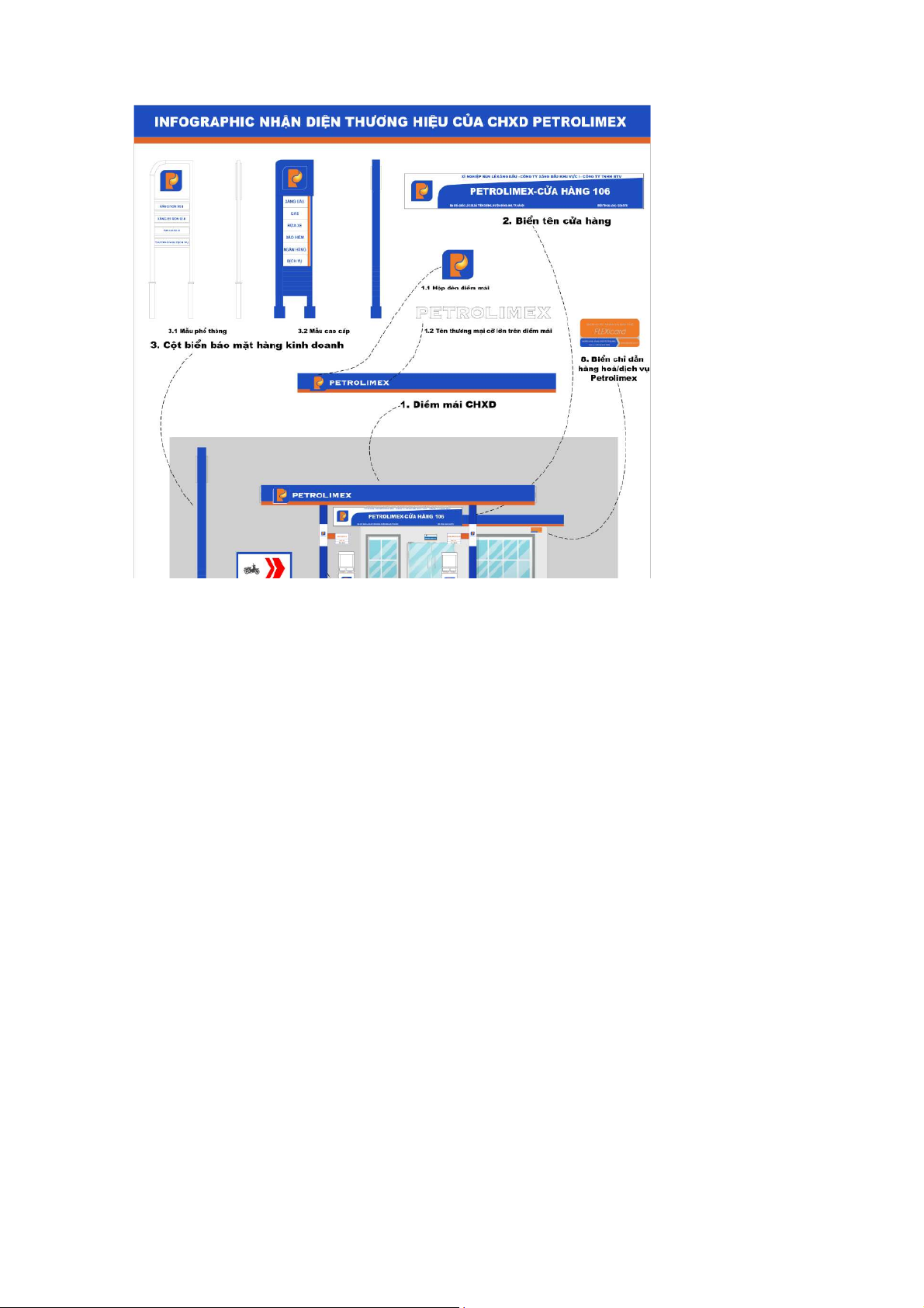 hàng, dán nhãn hiệu chữ "P" ở cột bơm xăng hay sơn mầu diềm mái cửa hàng (cam và
