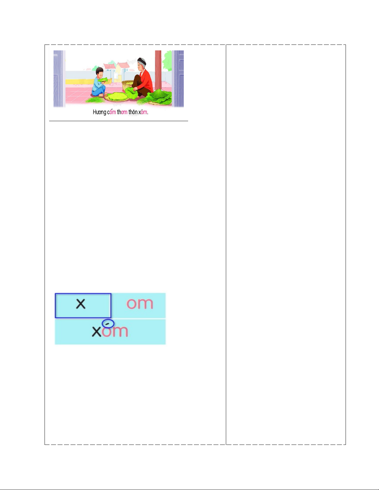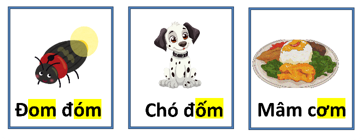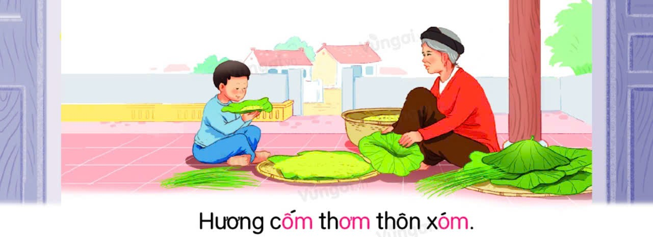 - GV thuyết minh ngắn gọn nội dung tranh: Gợi ý: Cốm thường có vào mùa nào trong tầm? Cốm làm từ gì? Em ăn cốm bao giờ chưa? - GV nói câu thuyết minh (nhận biết) dưới tranh. GV đọc thành tiếng câu nhận biết và yêu câu HS đọc theo. - GV giới thiệu các vần mới om, ôm, ơm. Viết tên bài lên bảng. Hoạt động 2: Đọc - GV giới thiệu cấu tạo và đánh vần các vần om, ôm, ơm. - GV yêu cầu học sinh nêu điểm giống và khác nhau giữa các vần om, ôm, ơm. - GV giới thiệu cách tạo tiếng Xóm. Có âm Om, thì ta thêm âm X trước vần Om và thêm dấu sắc phía trên. Ta tạo nên tiếng Xóm. - GV viết các tiếng khác và đọc to; Khóm; Vòm; Nộm; Tôm; Bờm; Rơm. - Yêu cầu HS luyện đọc theo. - GV chiếu các bức tranh cùng với các từ ngữ nội dung của tranh.