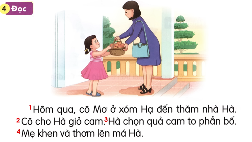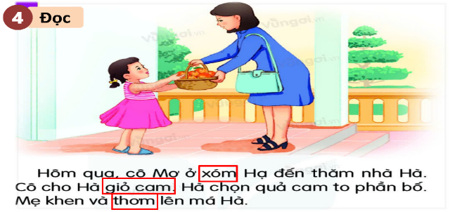 - GV nhận xét và khen lớp. | - HS quan sát tranh. - Cả lớp cùng lắng nghe nội dung trong tranh. - HS cùng GV đọc lại các từ xóm, giỏ cam, thơm. - HS đánh vần và đọc trơn lại các câu: 1. Hôm qua, cô Mơ ở xóm Hạ đến thăm nhà Hà. 2. Cô cho Hà giỏ cam. 3. Hà chọn quả cam to phần bố. 4. Mẹ khen và thơm lên má Hà. - Khi đọc gặp dấu phẩy thì nghỉ hơi, dấu chấm thì ngắt hơi. |