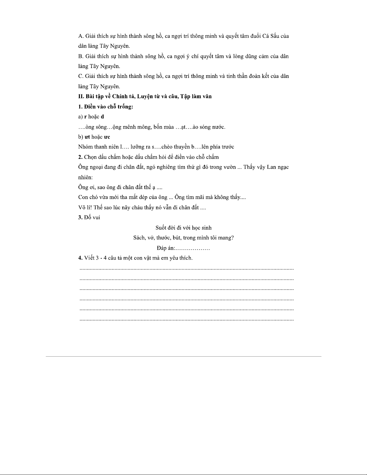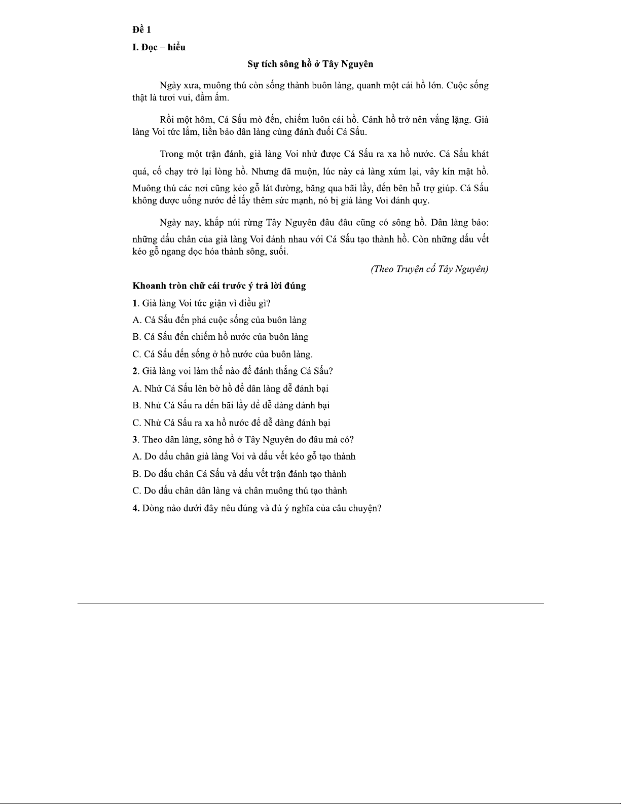 Tiếng Việt Lớp 2 - Đề 1: Đọc Hiểu Sự Tích Sông Hồ Tây Nguyên