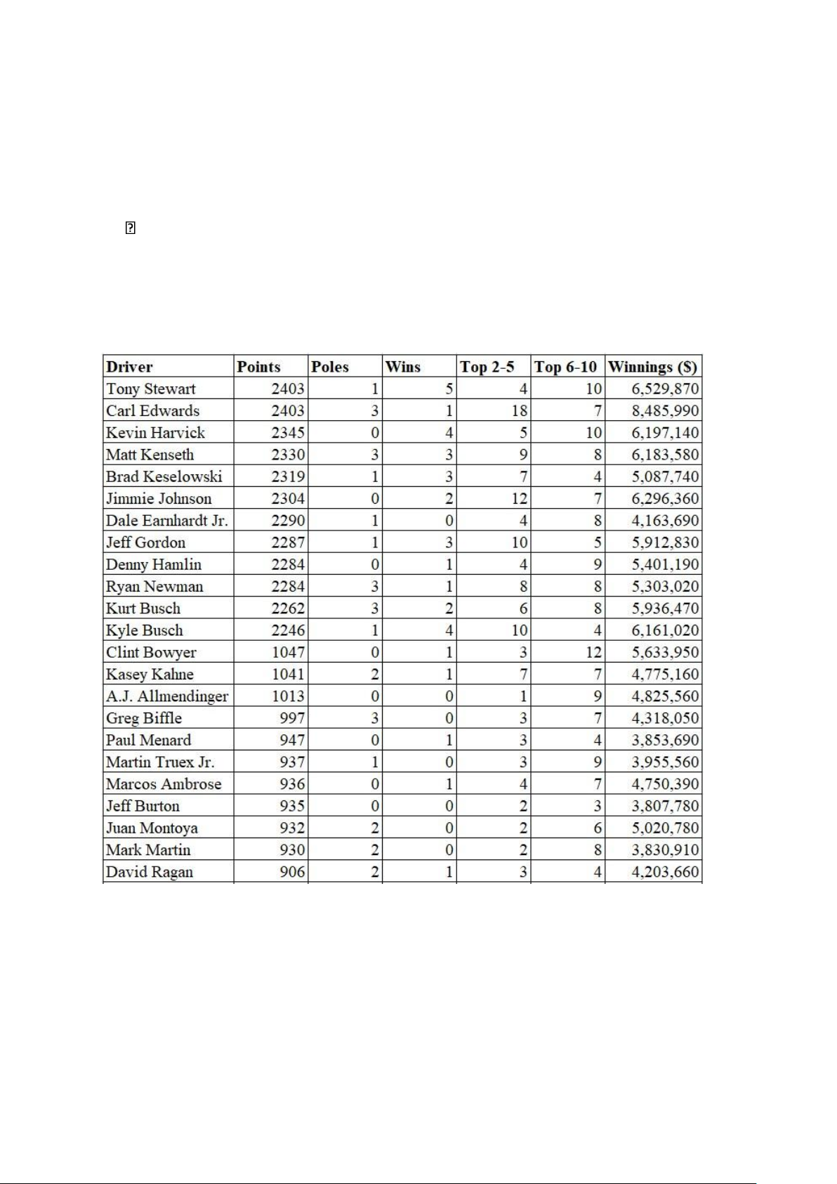 Poles Wins Top 5 Top 10 Winnings ($) Tony Stewart 2403 1 5 9 19 6,529,870 Carl Edwards 2403 3 1 19 26 8,485,990 Kevin Harvick 2345 0 4 9 19 6,197,140 Matt Kenseth 2330 3 3 12 20 6,183,580 Brad Keselowski 2319 1 3 10 14 5,087,740 Jimmie Johnson 2304 0 2 14 21 6,296,360 Dale Earnhardt Jr. 2290 1 0 4 12 4,163,690 Jeff Gordon 2287 1 3 13 18 5,912,830 Denny Hamlin 2284 0 1 5 14 5,401,190 lOMoAR cPSD| 61601590 Ryan Newman 2284 3 1 9 17 5,303,020 Kurt Busch 2262 3 2 8 16 5,936,470 Kyle Busch 2246 1 4 14 18 6,161,020 Clint Bowyer 1047 0 1 4 16 5,633,950 Kasey Kahne 1041 2 1 8 15 4,775,160 A.J. Allmendinger 1013 0 0 1 10 4,825,560 Greg Biffle 997 3 0 3 10 4,318,050 Paul Menard 947 0 1 4 8 3,853,690 Martin Truex Jr. 937 1 0 3 12 3,955,560 Marcos Ambrose 936 0 1 5 12 4,750,390 Jeff Burton 935 0 0 2 5 3,807,780 Juan Montoya 932 2 0 2 8 5,020,780 Mark Martin 930 2 0 2 10 3,830,910 David Ragan 906 2 1 4 8 4,203,660 Joey Logano 902 2 0 4 6 3,856,010 Brian Vickers 846 0 0 3 7 4,301,880 Regan Smith 820 0 1 2 5 4,579,860 Jamie McMurray 795 1 0 2 4 4,794,770 David Reutimann 757 1 0 1 3 4,374,770 Bobby Labonte 670 0 0 1 2 4,505,650 David Gilliland 572 0 0 1 2 3,878,390 Casey Mears 541 0 0 0 0 2,838,320 Dave Blaney 508 0 0 1 1 3,229,210 Andy Lally* 398 0 0 0 0 2,868,220 Robby Gordon 268 0 0 0 0 2,271,890 lOMoAR cPSD| 61601590 J.J. Yeley 192 0 0 0 0 2,559,500
