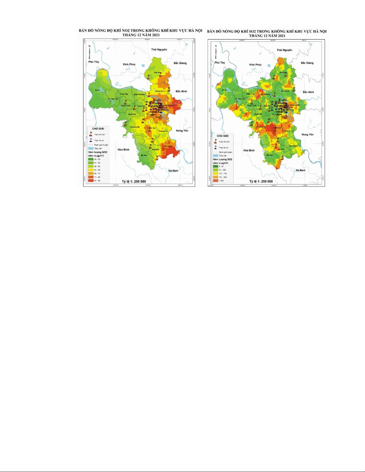Hình 4. Bản đồ phân bố nồng độ khí N O2 và SO2 tại khu vực Hà Nội.