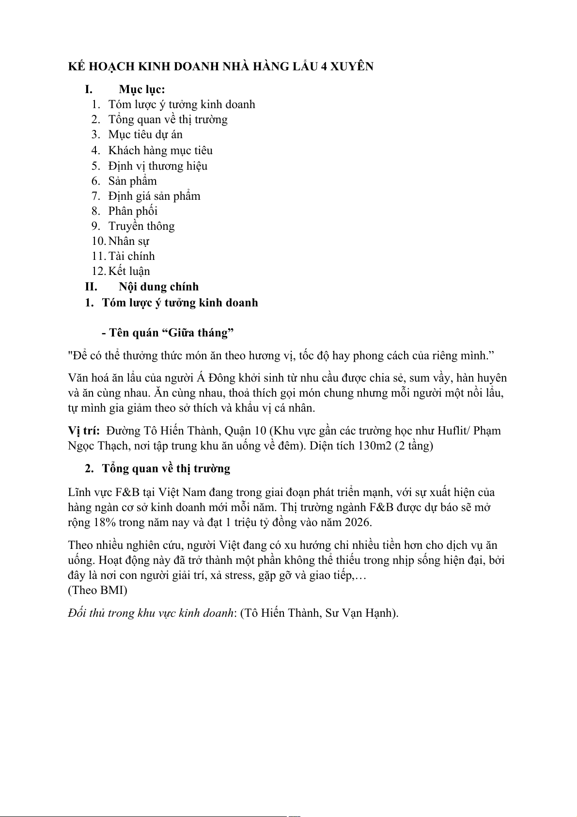KẾ HOẠCH KINH DOANH NHÀ HÀNG LẨU 4 XUYÊN I. Mục lục: