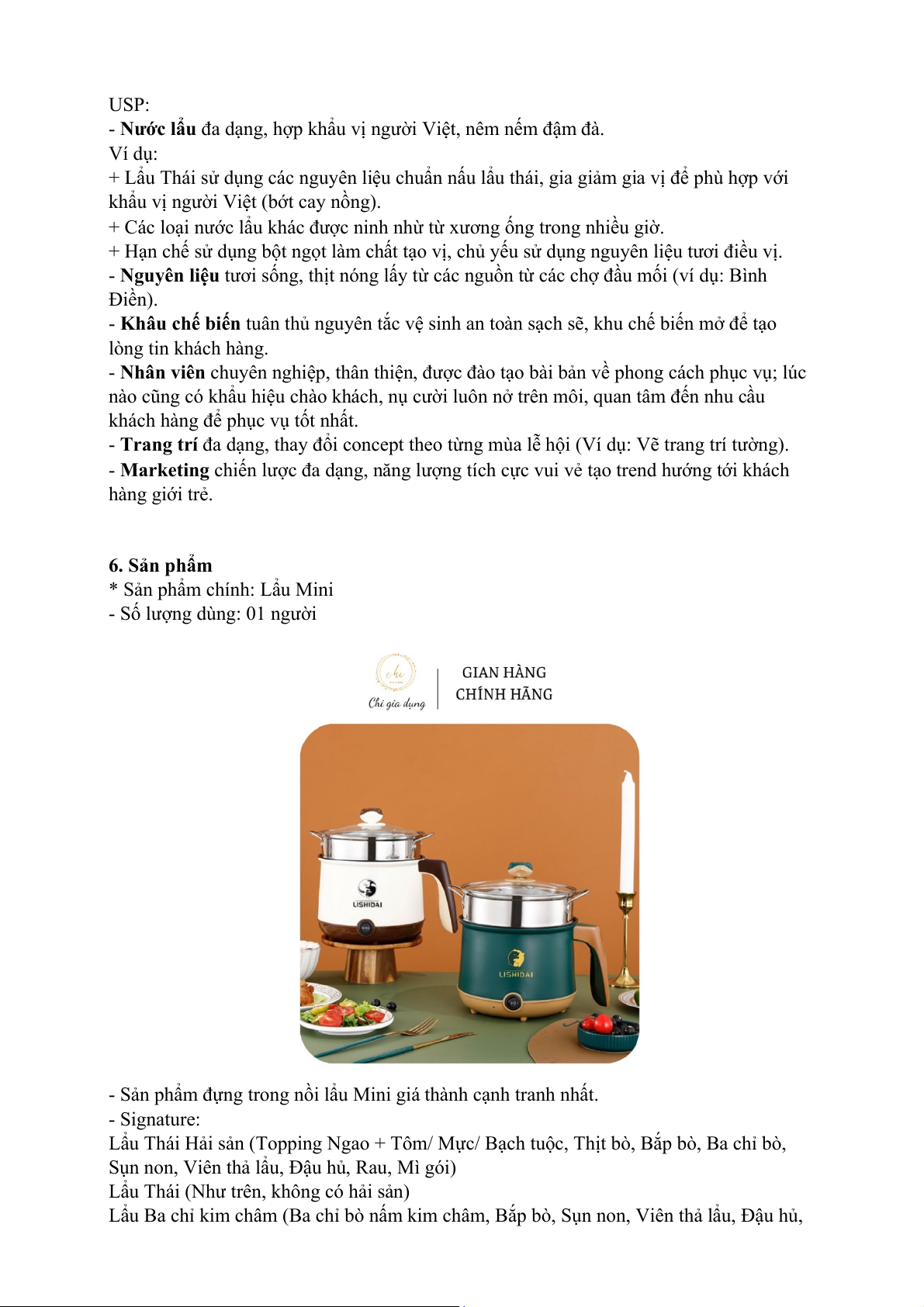 7.Định giá sản phẩm Nhóm sản Món ăn Số lượng Đơn vị tính Giá thành Ghi chú phẩm (VNĐ) Nước lẩu + Lẩu xương 1 Phần nhỏ 59,000 Tùy từng loại Topping ăn Lẩu Thảo Dược 1 Phần nhỏ 59,000 lẩu sẽ có loại kèm (Gồm có: Topping ăn kèm