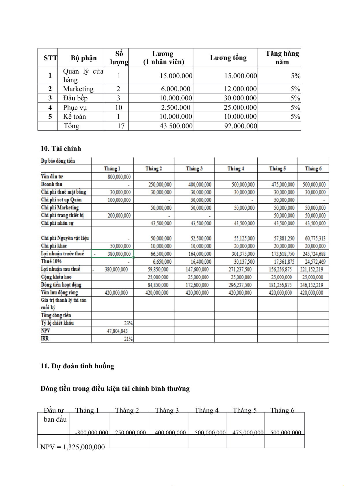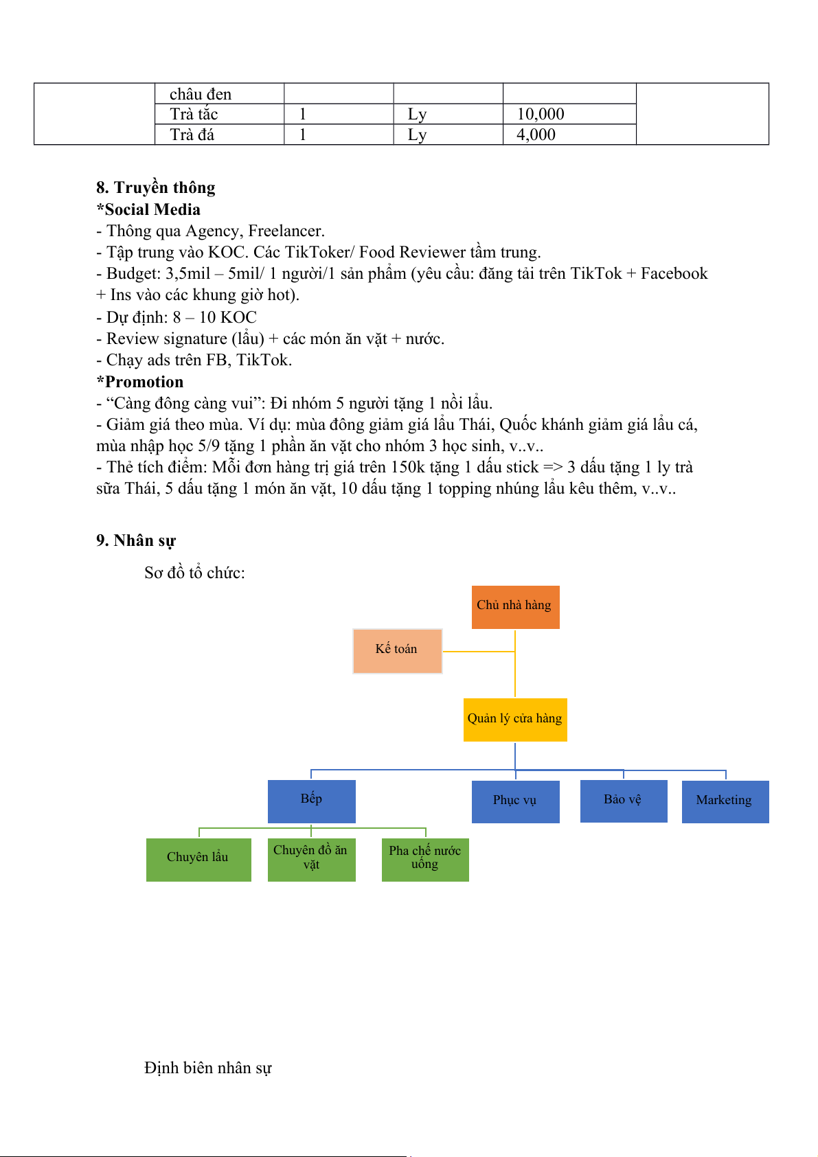 sữa Thái, 5 dấu tặng 1 món ăn vặt, 10 dấu tặng 1 topping nhúng lẩu kêu thêm, v..v.. 9. Nhân sự Sơ đồ tổ chức: Chủ nhà hàng Kế toán Quản lý cửa hàng Bếp Phục vụ Bảo vệ Marketing Chuyên lẩu Chuyên đồ ăn Pha chế nước vặt uống Định biên nhân sự Số Lương Tăng hàng STT Bộ phận Lương tổng lượng (1 nhân viên) năm Quản lý cửa 1 1 15.000.000 15.000.000 5% hàng 2 Marketing 2 6.000.000 12.000.000 5% 3 Đầu bếp 3 10.000.000 30.000.000 5% 4 Phục vụ 10 2.500.000 25.000.000 5% 5 Kế toán 1 10.000.000 10.000.000 5% Tổng 17 43.500.000 92.000.000 10. Tài chính