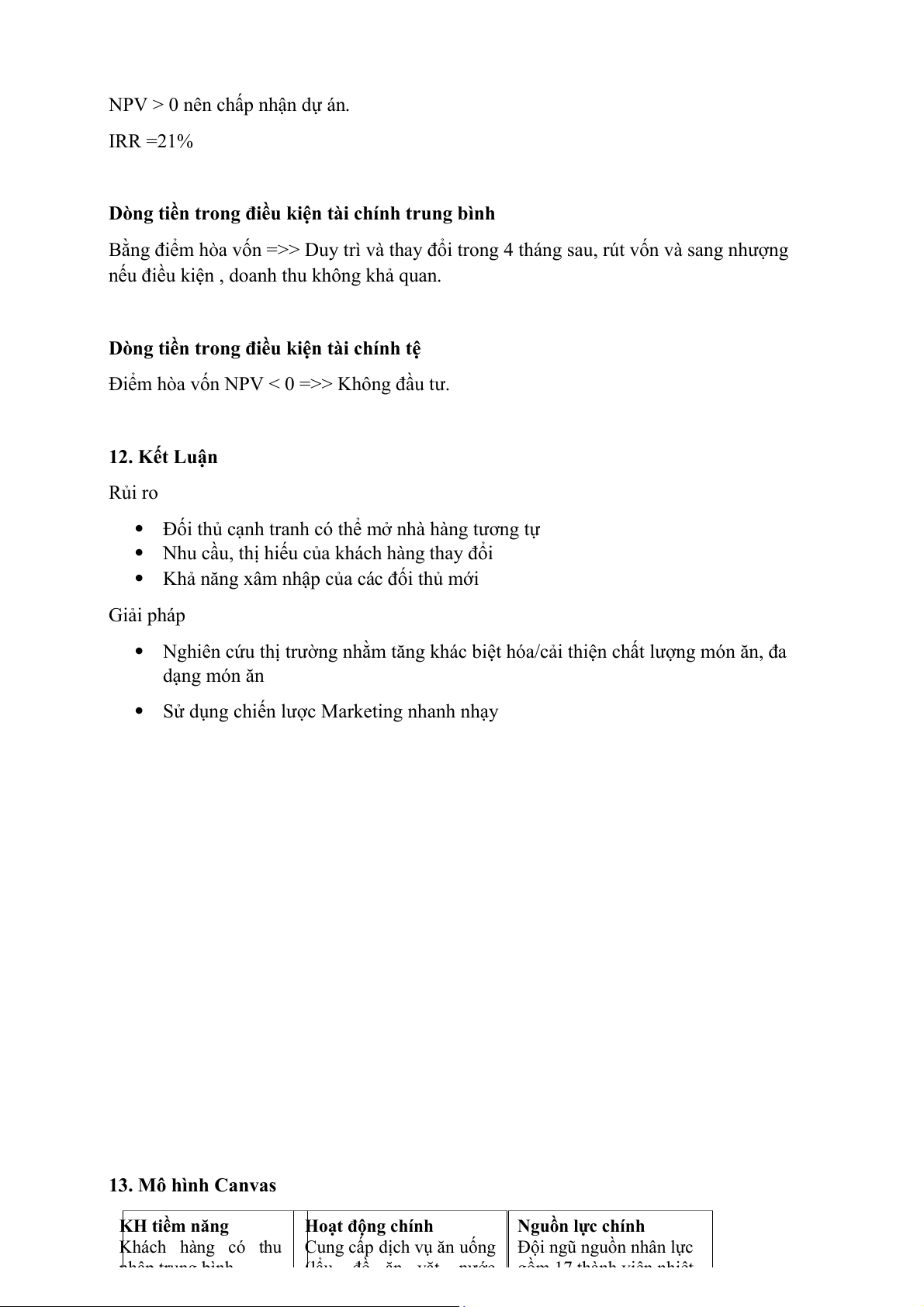 Điểm hòa vốn NPV < 0 =>> Không đầu tư. 12. Kết Luận Rủi ro