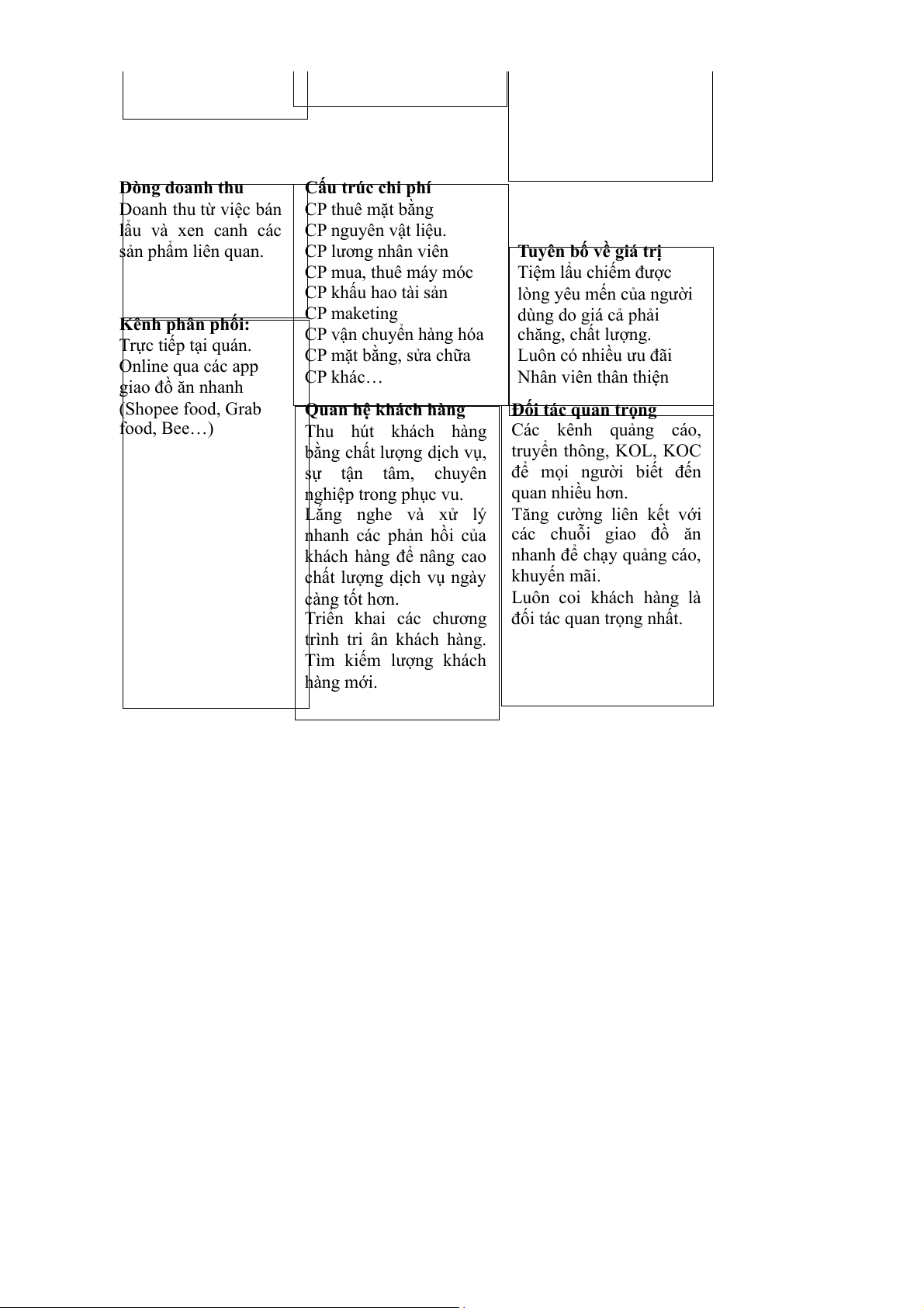 Đối tác quan trọng food, Bee…) Thu hút khách hàng Các kênh quảng cáo,