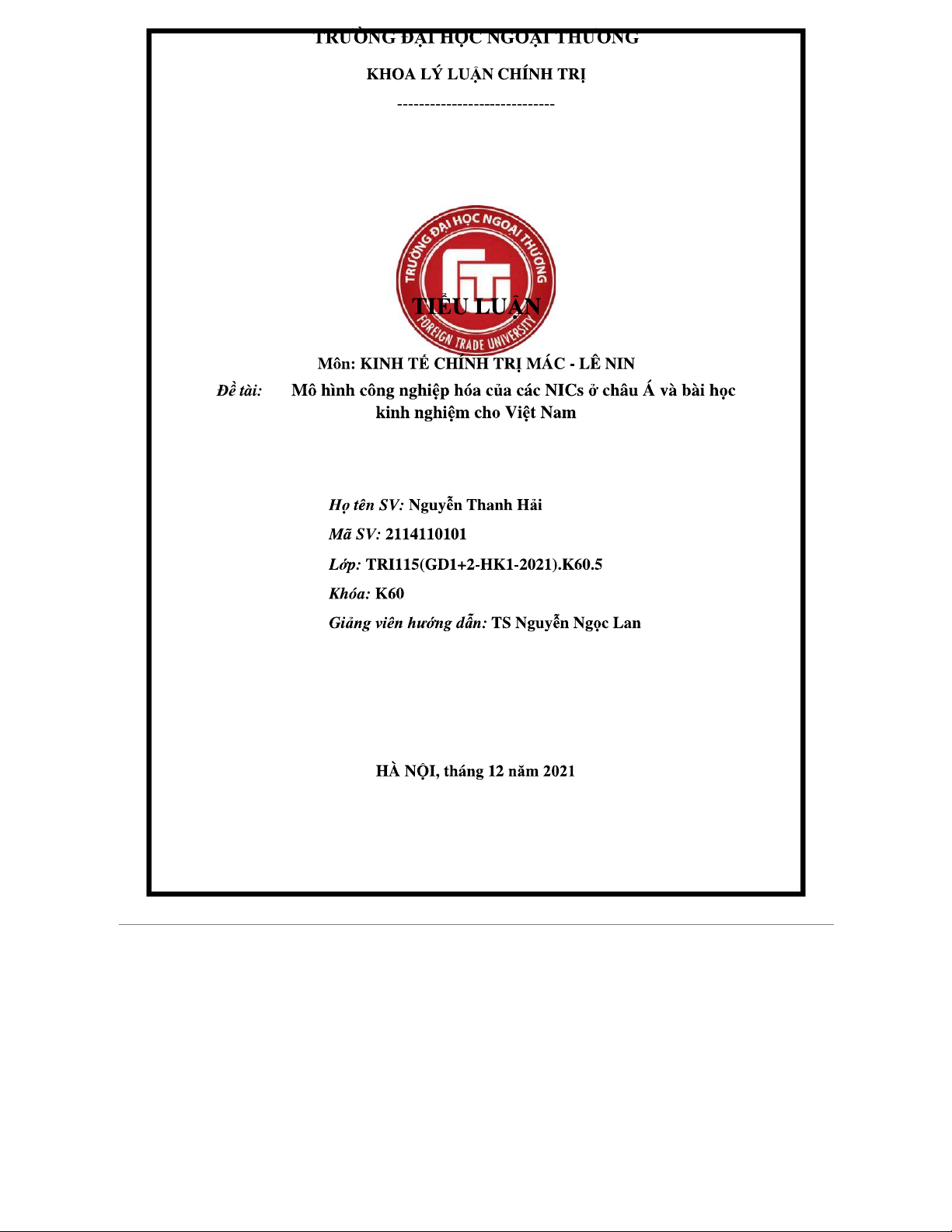 Tiểu luận Kinh Tế Chính Trị Mác - Lênin (KTCT): Mô Hình CNH và Bài Học từ NICs ở Châu Á