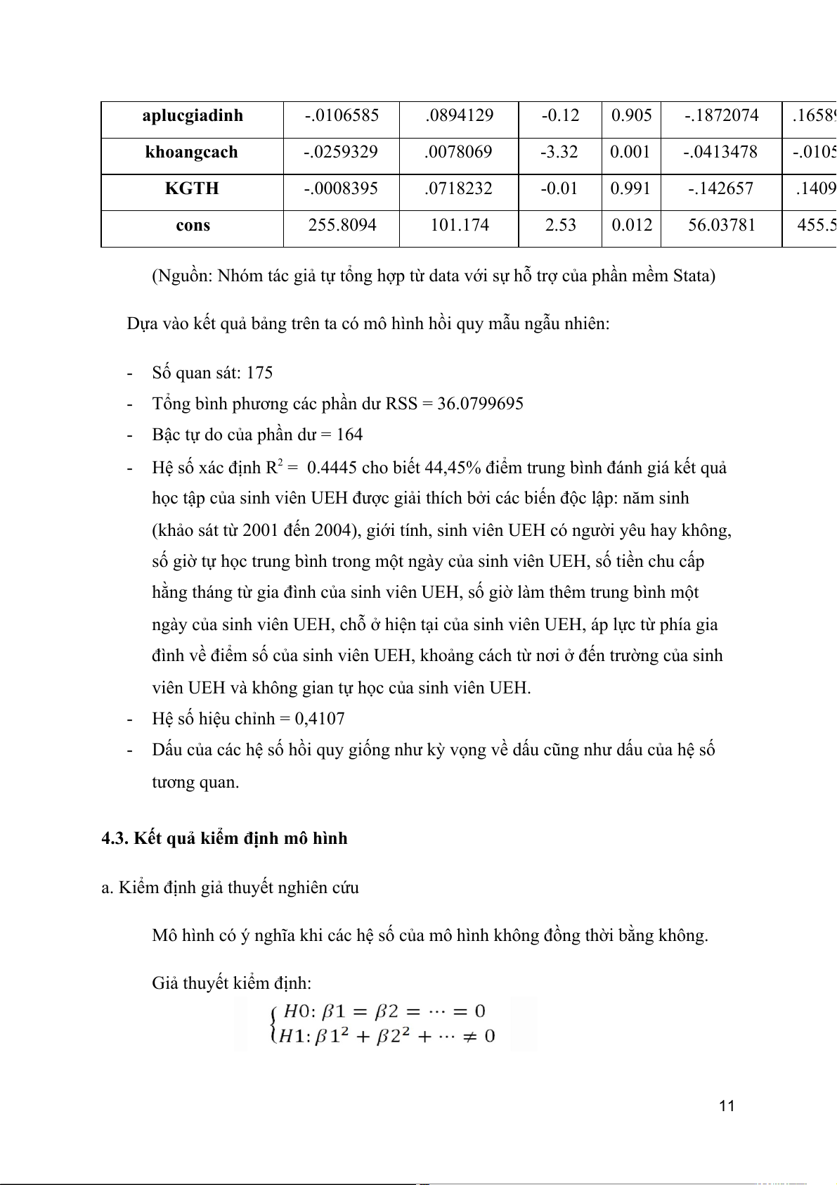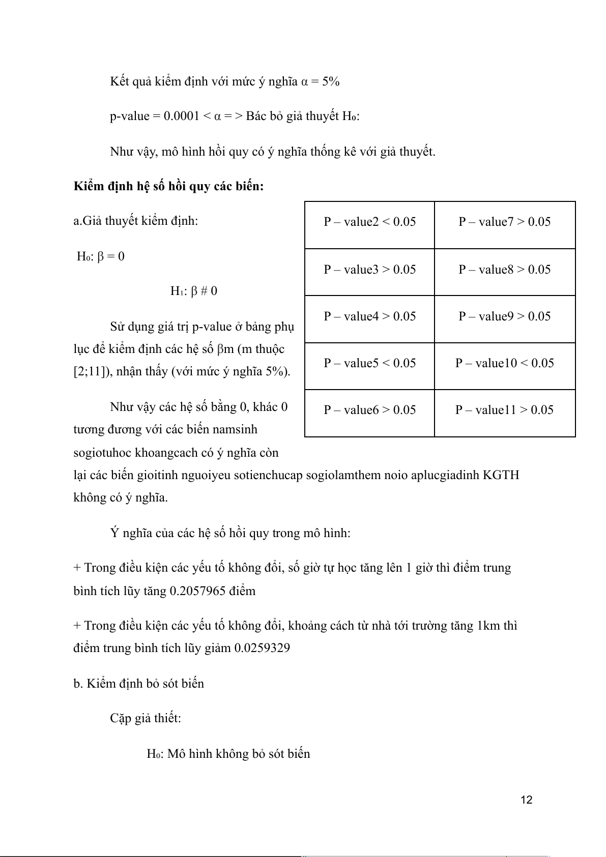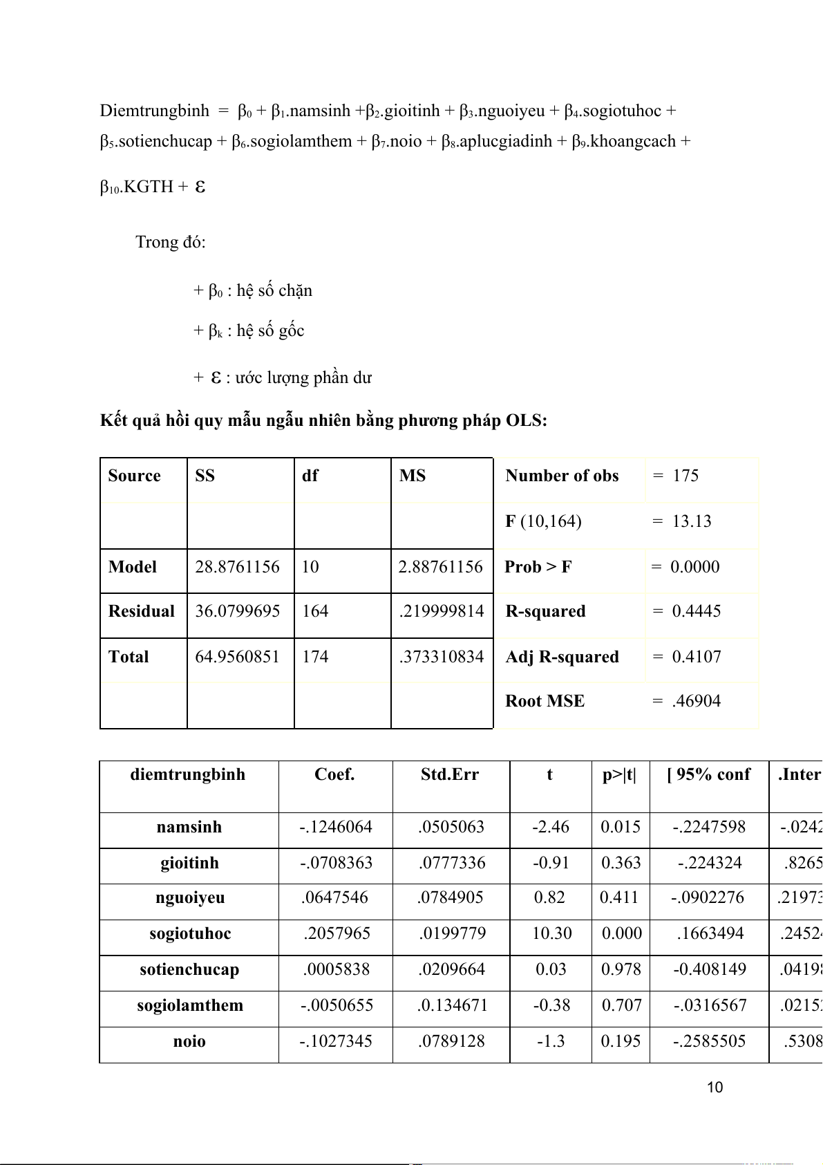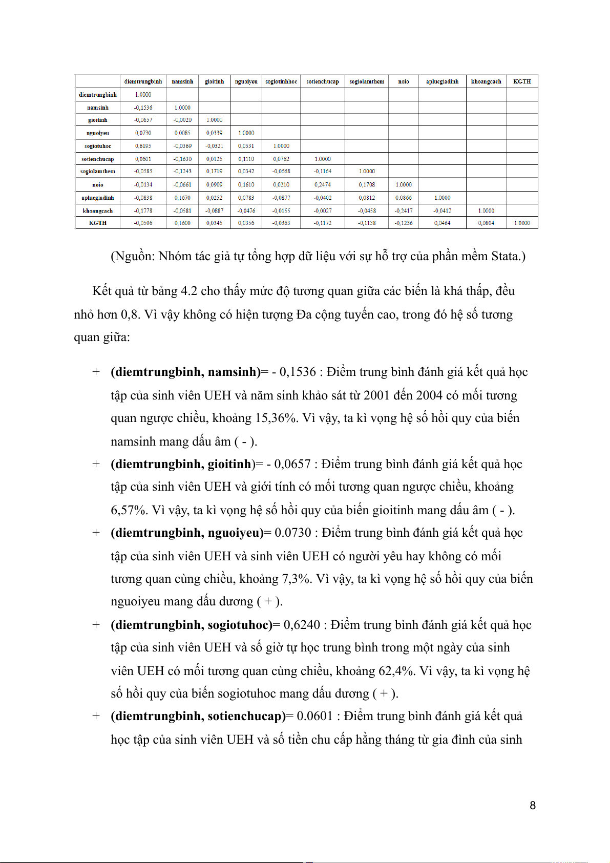 c. Kiểm định đa cộng tuyến: Variable VIF 1/VIF noio 1.22 0.821707 sotienchucap 1.15 0.866307 sogiolamthem 1.14 0.880851 namsinh 1.11 0.904085 khoangcach 1.08 0.923822 KGTH 1.07 0.934547 aplucgiadinh 1.06 0.943146 gioitinh 1.05 0.956110 nguoiyeu 1.05 0.956416 sogiotuhoc 1.02 0.979018 Mean VIF 1.09