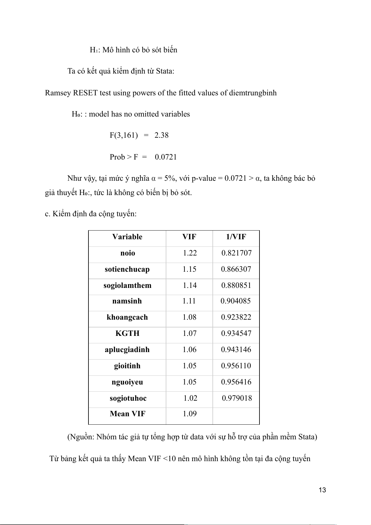 Từ bảng kết quả ta thấy Mean VIF <10 nên mô hình không tồn tại đa cộng tuyến 13