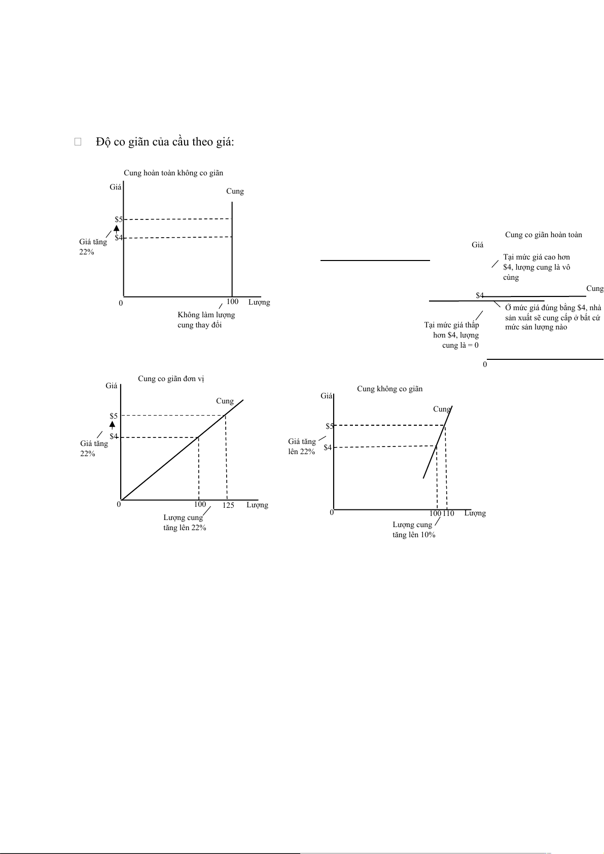 Cung hoàn toàn không co giãn Giá Cung $5 $4 Cung co giãn hoàn toàn Giá tăng Giá 22% Tại mức giá cao hơn $4, lượng cung là vô cùng Cung $4 0 100 Lượng