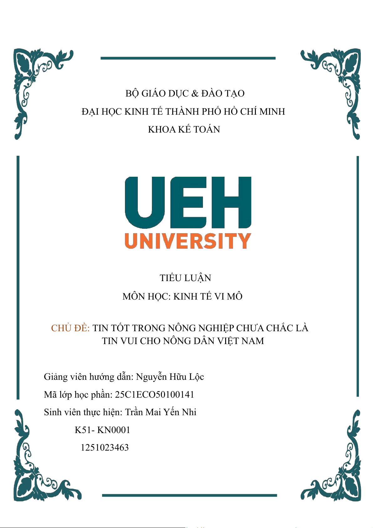 ĐẠI HỌC KINH TẾ THÀNH PHỐ HỒ CHÍ MINH KHOA KẾ TOÁN TIỂU LUẬN MÔN HỌC: KINH TẾ VI MÔ