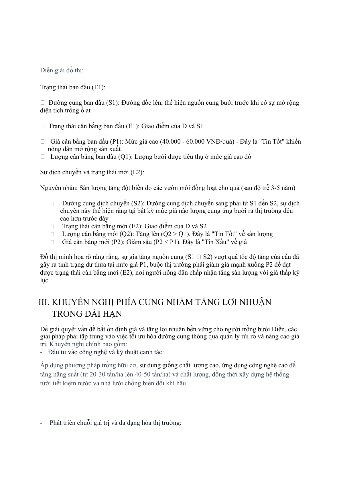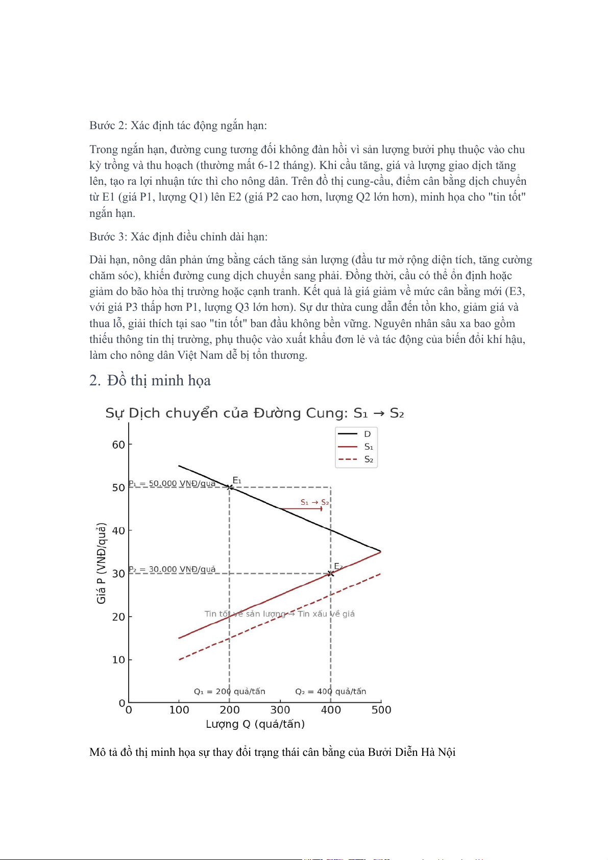 Đường cung ban đầu (S1): Đường dốc lên, thể hiện nguồn cung bưởi trước khi có sự mở rộng diện tích trồng ồ ạt