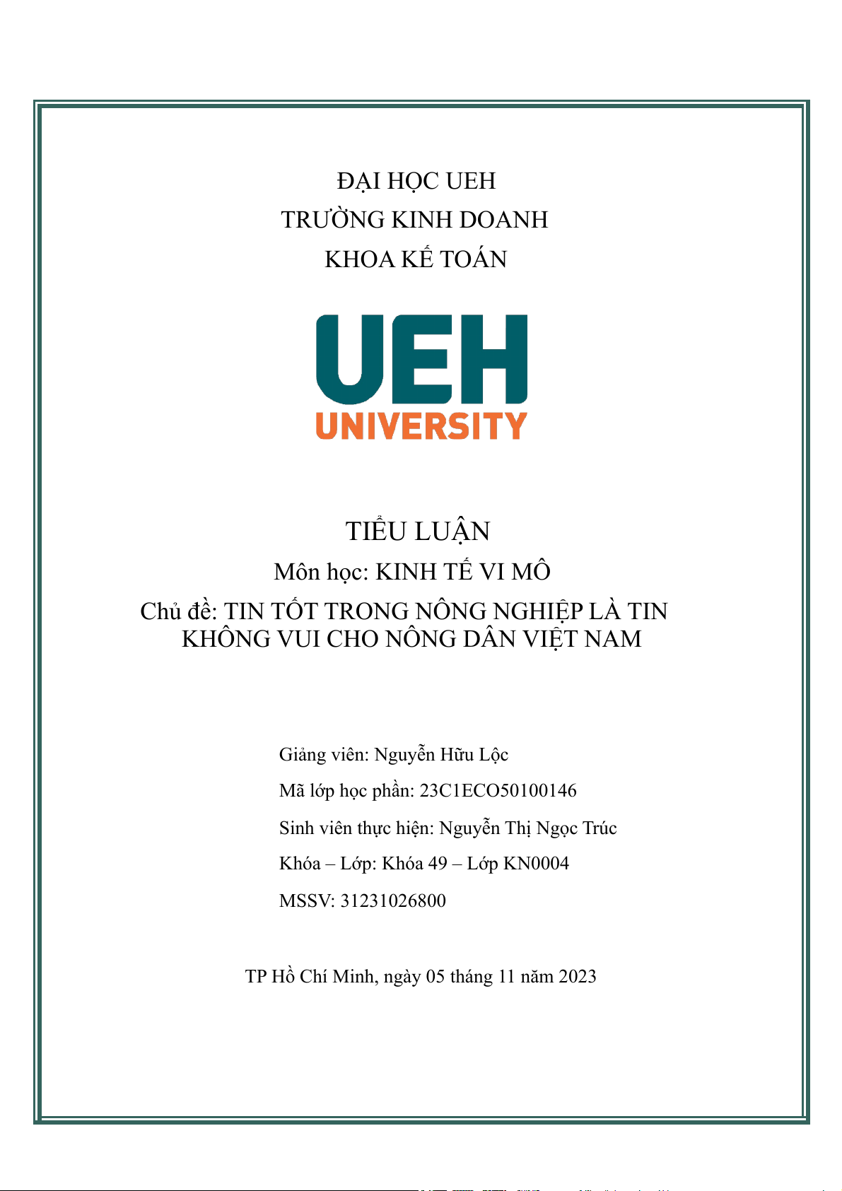 ĐẠI HỌC UEH TRƯỜNG KINH DOANH KHOA KẾ TOÁN TIỂU LUẬN Môn học: KINH TẾ VI MÔ