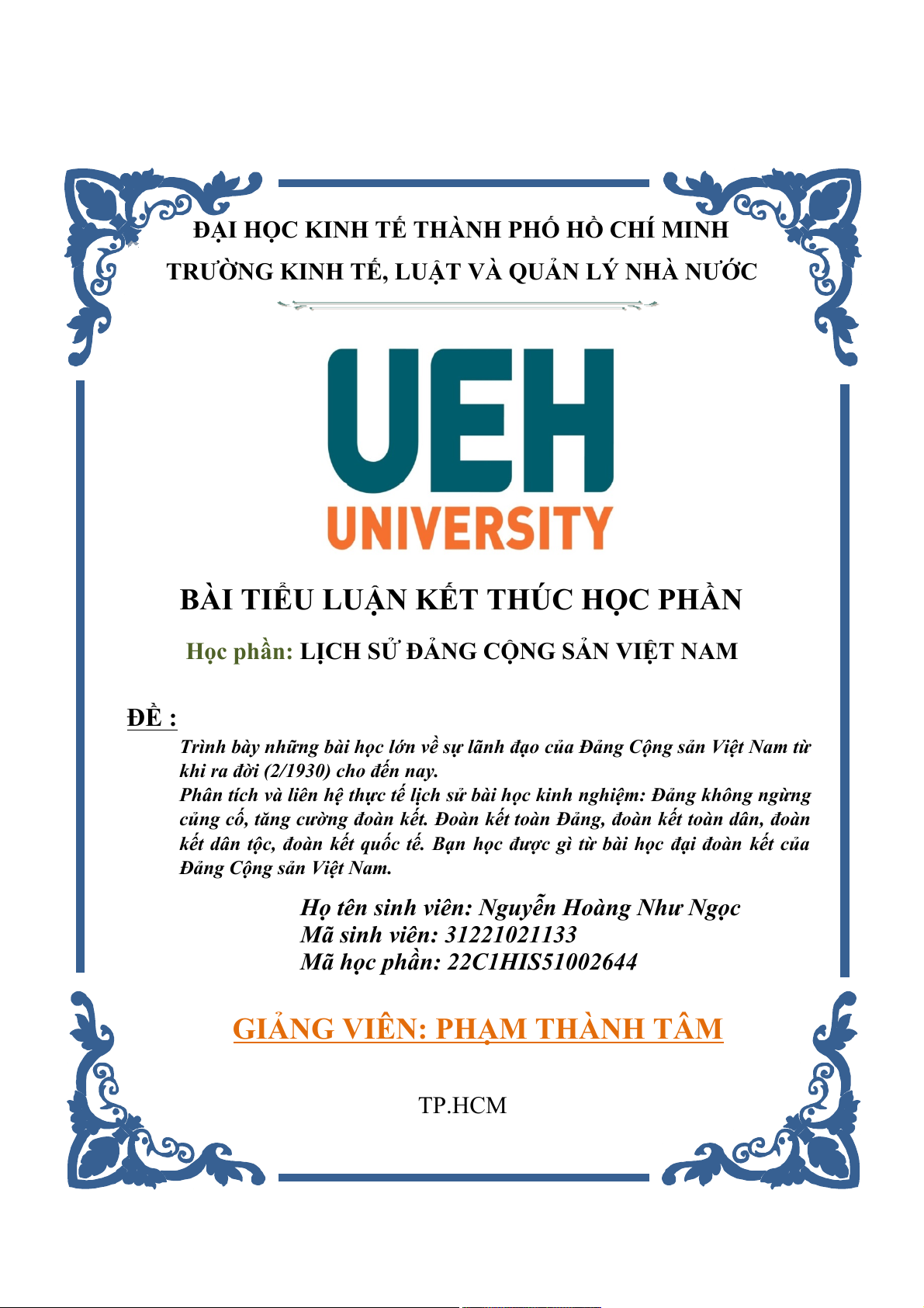 Học phần: LỊCH SỬ ĐẢNG CỘNG SẢN VIỆT NAM ĐỀ :