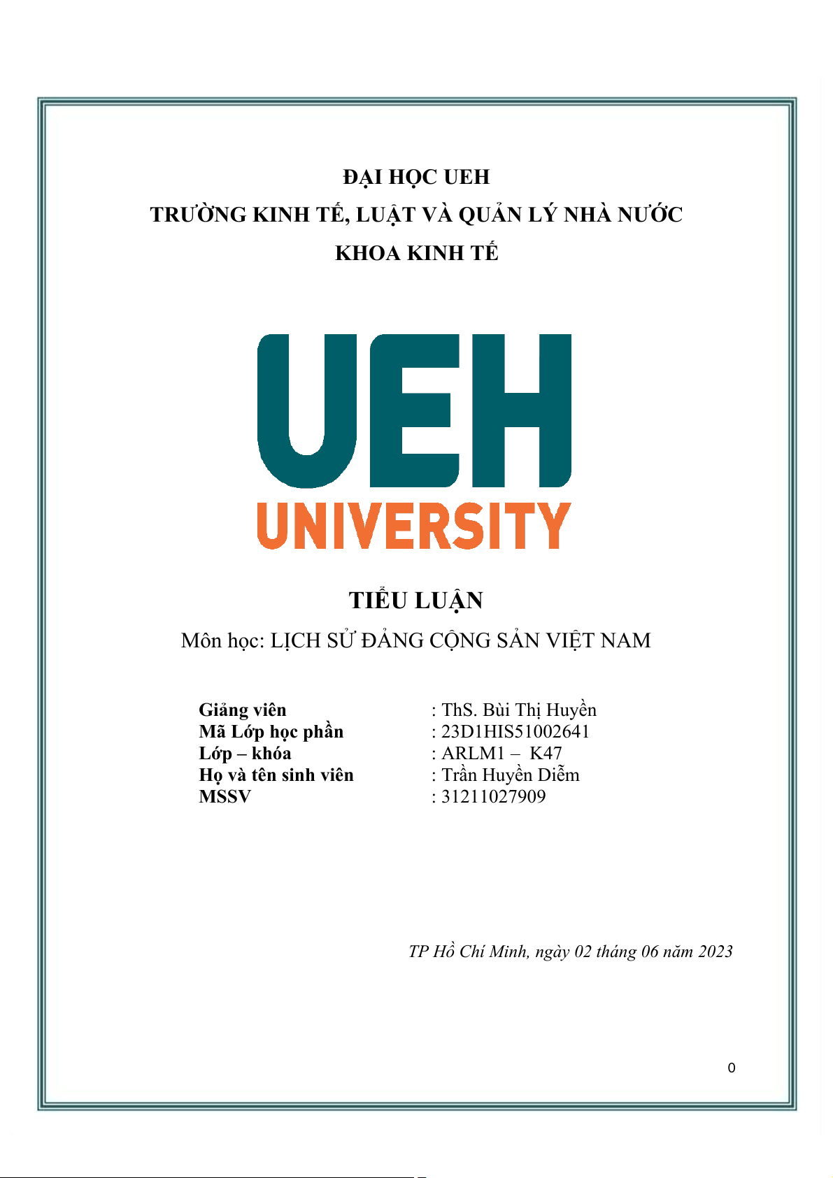 Môn học: LỊCH SỬ ĐẢNG CỘNG SẢN VIỆT NAM Giảng viên : ThS. Bùi Thị Huyền Mã Lớp học phần : 23D1HIS51002641 Lớp – khóa : ARLM1 – K47