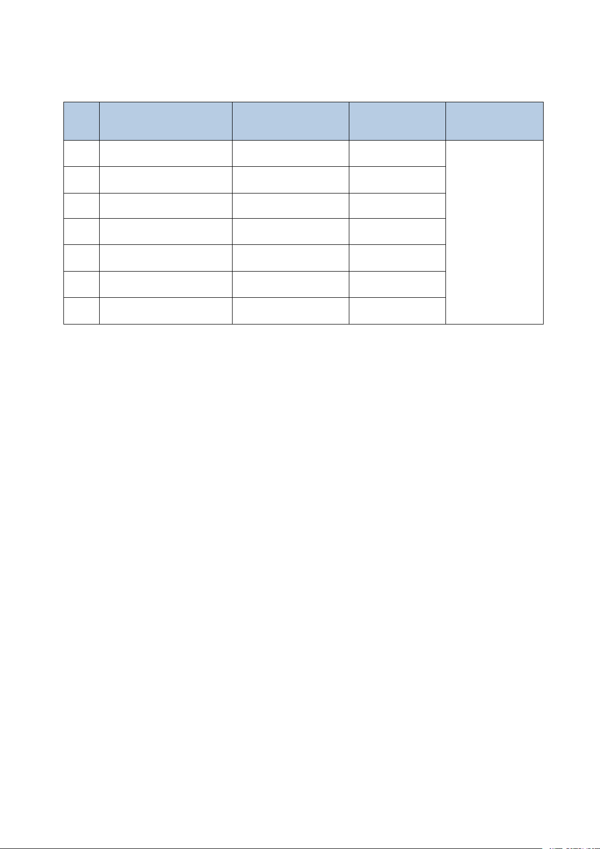 BẢNG ĐÁNH GIÁ HOẠT ĐỘNG NHÓM Công việc phụ Tham gia bài STT Tên thành viên Mã số sinh viên trách tập nhóm 1 Đoàn Ngọc Vân Anh 33161020250 Nội dung Tham gia đầy đủ cả nhóm. Tất 2 Nguyễn Thị Hoa 33161020142