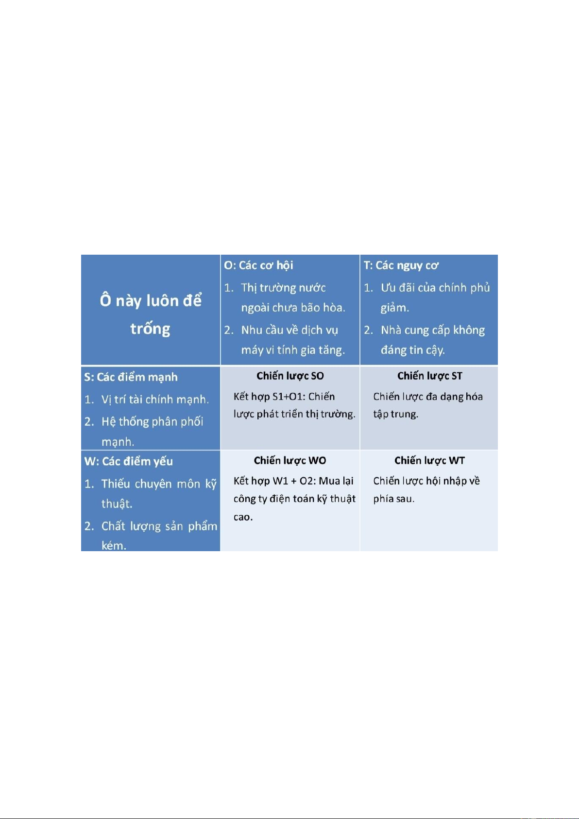 • Có kinh nghiệm lâu năm trong thị trường. Cơ hội: Chiến lược SO: Chiến lược WO: