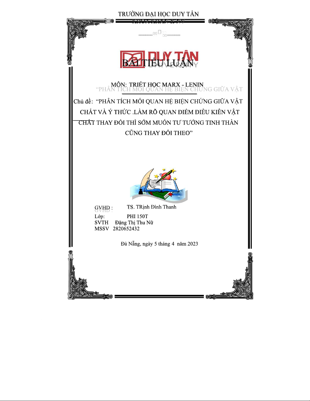 TIỂU LUẬN MÔN TRIẾT HỌC MARX - LENIN PHI150T: VẤN ĐỀ VẬT CHẤT VÀ Ý THỨC