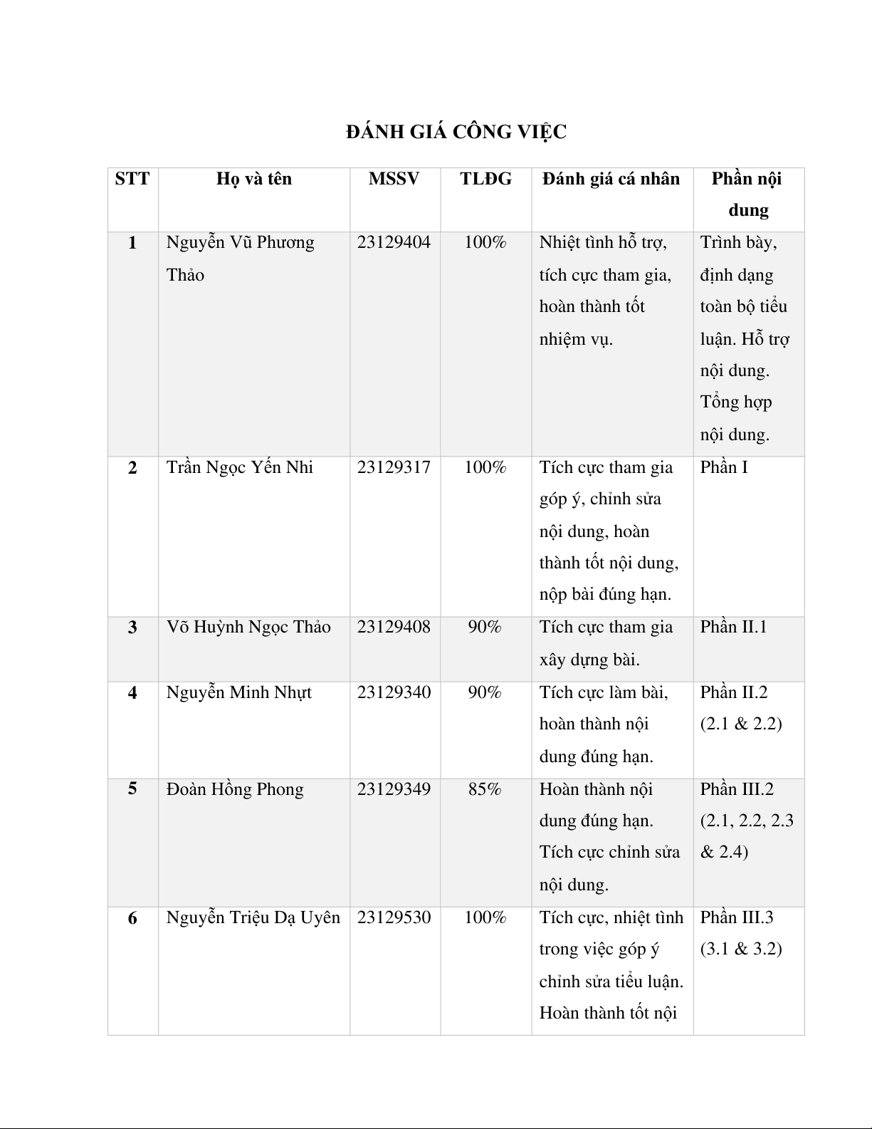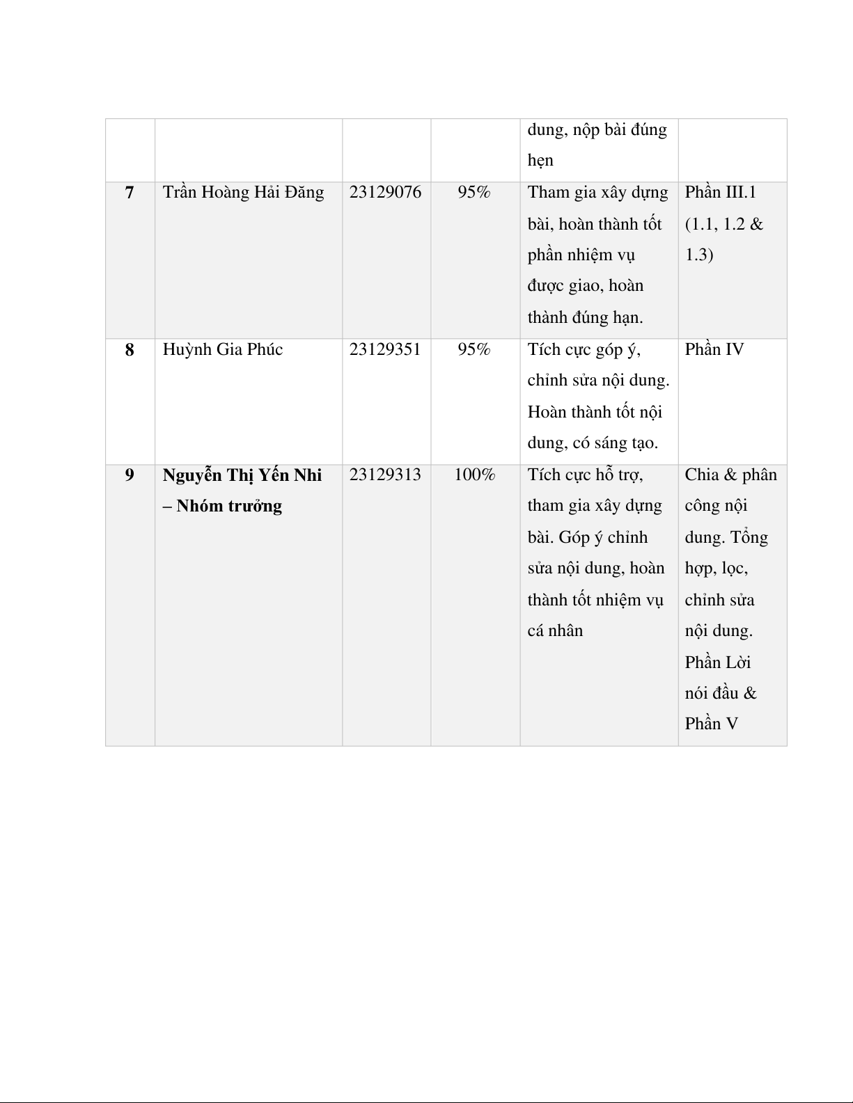 bài, hoàn thành tốt (1.1, 1.2 & phần nhiệm vụ 1.3) được giao, hoàn thành đúng hạn. 8 Huỳnh Gia Phúc 23129351 95% Tích cực góp ý, Phần IV chỉnh sửa nội dung. Hoàn thành tốt nội dung, có sáng tạo.