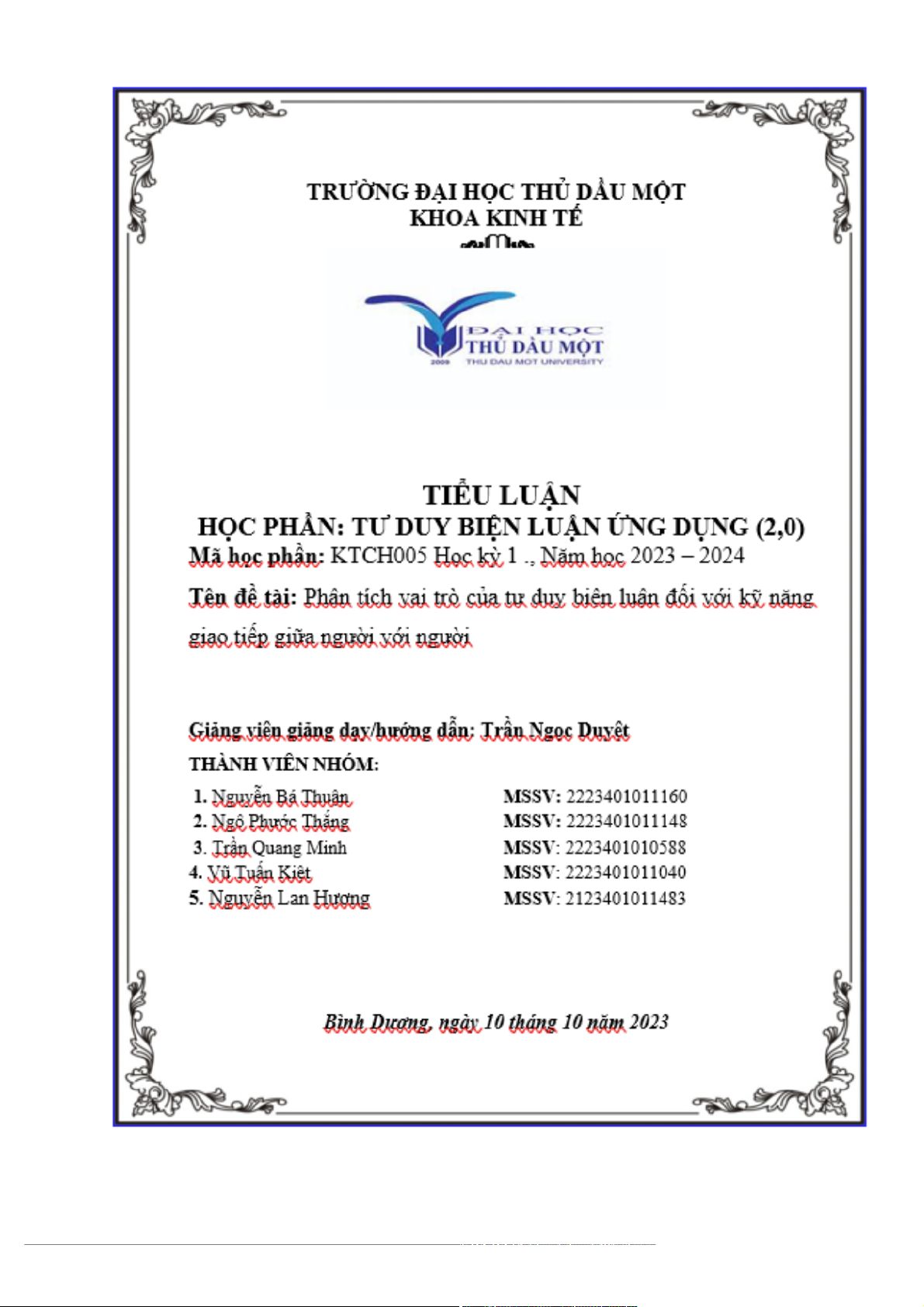 Bình Dương, ngày 10 tháng 10 năm 2023 i ii iii TIỂU LUẬN