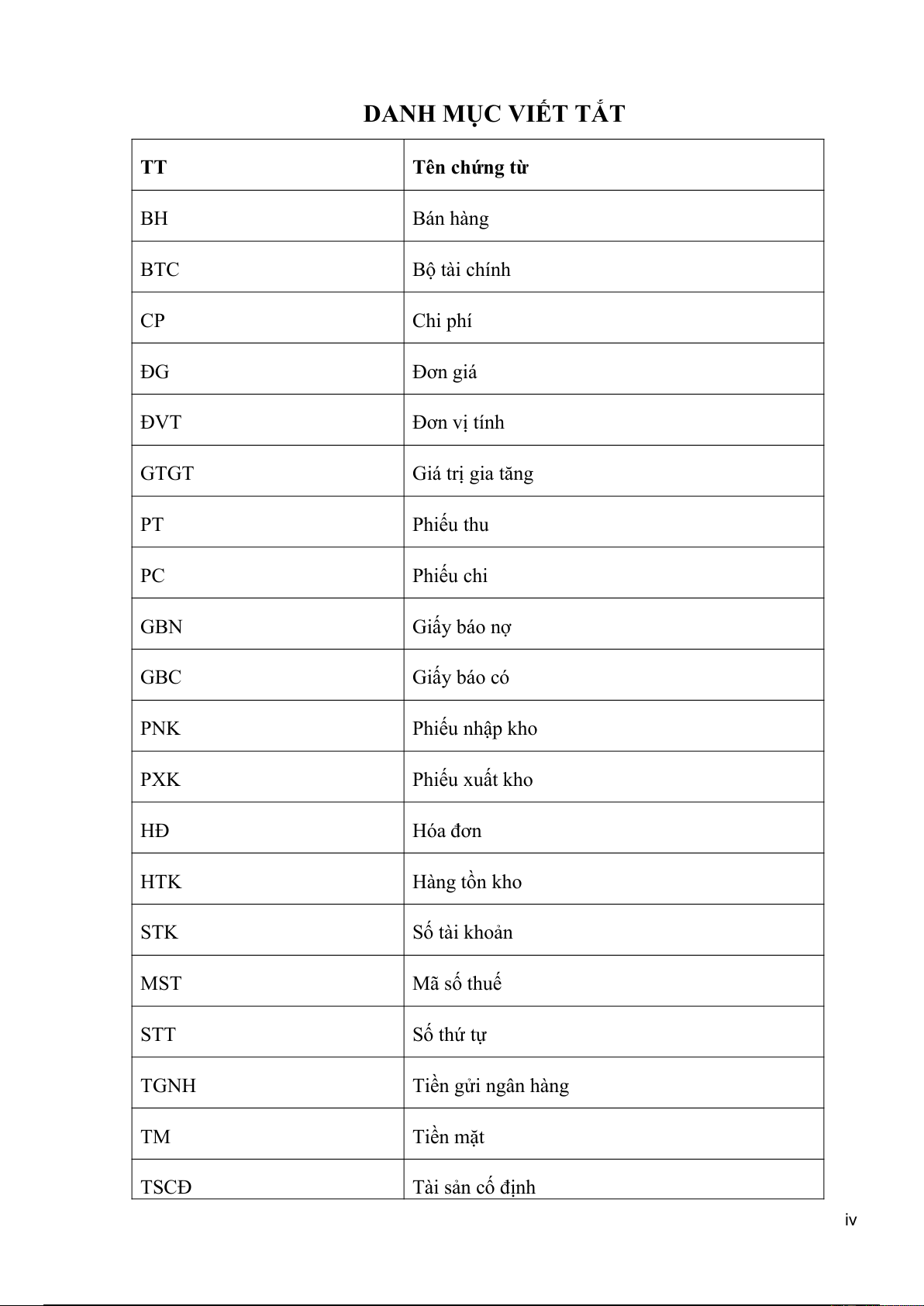 Quy trình luân chuyển chứng từ mua hàng i i 4 / 15 DANH MỤC VIẾT TẮT TT Tên chứng từ BH Bán hàng BTC Bộ tài chính CP Chi phí ĐG Đơn giá ĐVT Đơn vị tính GTGT Giá trị gia tăng PT Phiếu thu PC Phiếu chi GBN Giấy báo nợ GBC Giấy báo có PNK Phiếu nhập kho PXK Phiếu xuất kho HĐ Hóa đơn HTK Hàng tồn kho STK Số tài khoản MST Mã số thuế STT Số thứ tự TGNH Tiền gửi ngân hàng TM Tiền mặt TSCĐ Tài sản cố định iv 5 / 15 TT Thông tư VNĐ Việt Nam đồng BGĐ Ban giám đốc BHXH Bảo hiểm xã hôi TNDN Thu nhập doanh nghiệp DT Doanh thu v 6 / 15