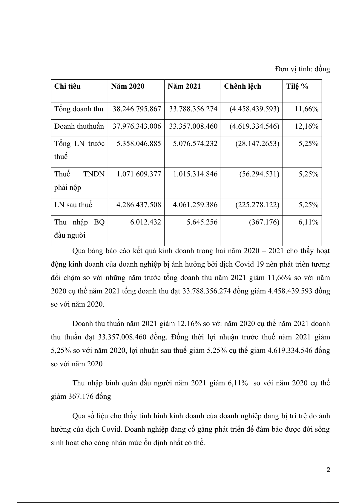 bảng báo cáo kết quả kinh doanh năm 2020 -2021 1 7 / 15 Đơn vị tính: đồng Chỉ tiêu Năm 2020 Năm 2021 Chênh lệch Tỉlệ %