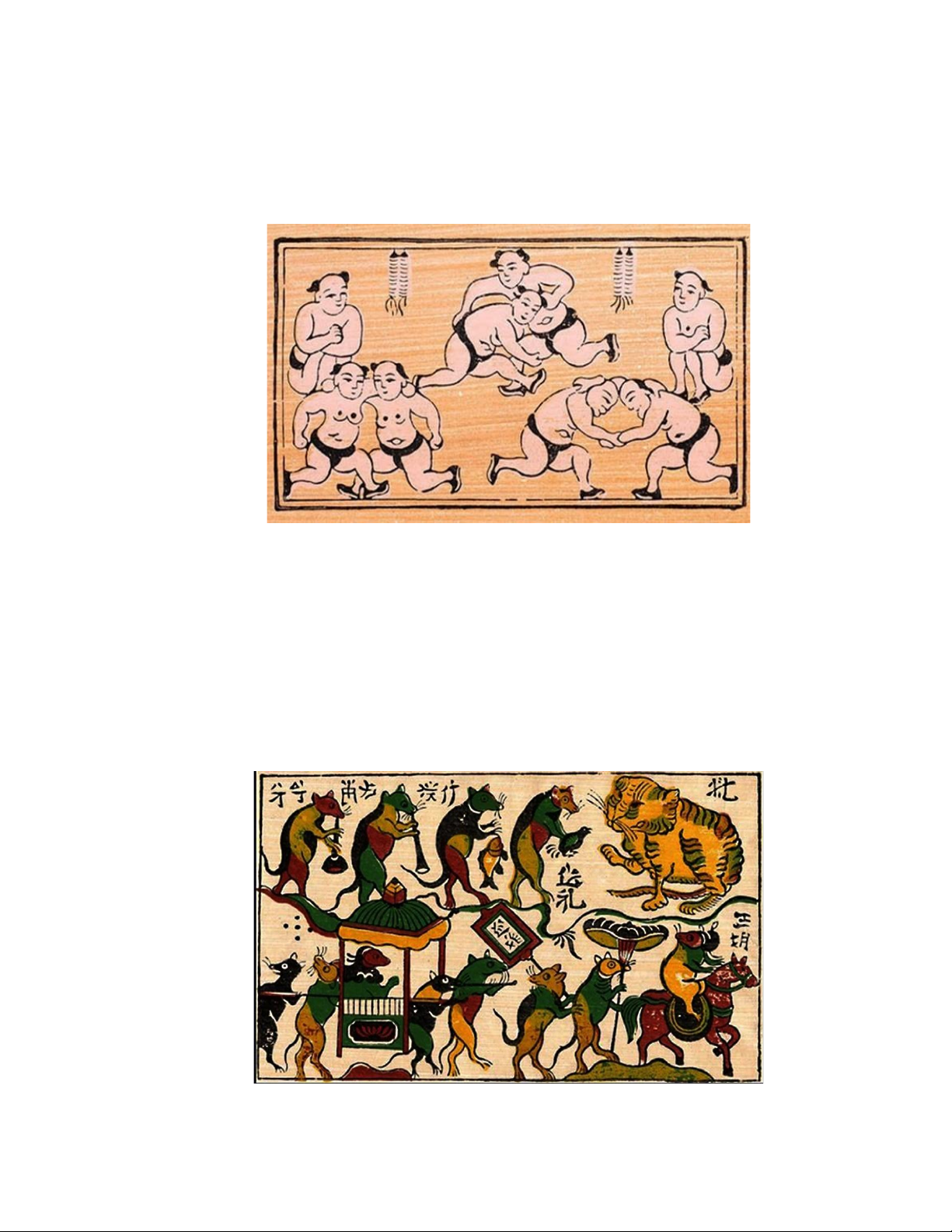 Tranh “Đấu vật”: đề cao tinh thần thượng võ. Đấu vật là môn võ cổ truyền của
