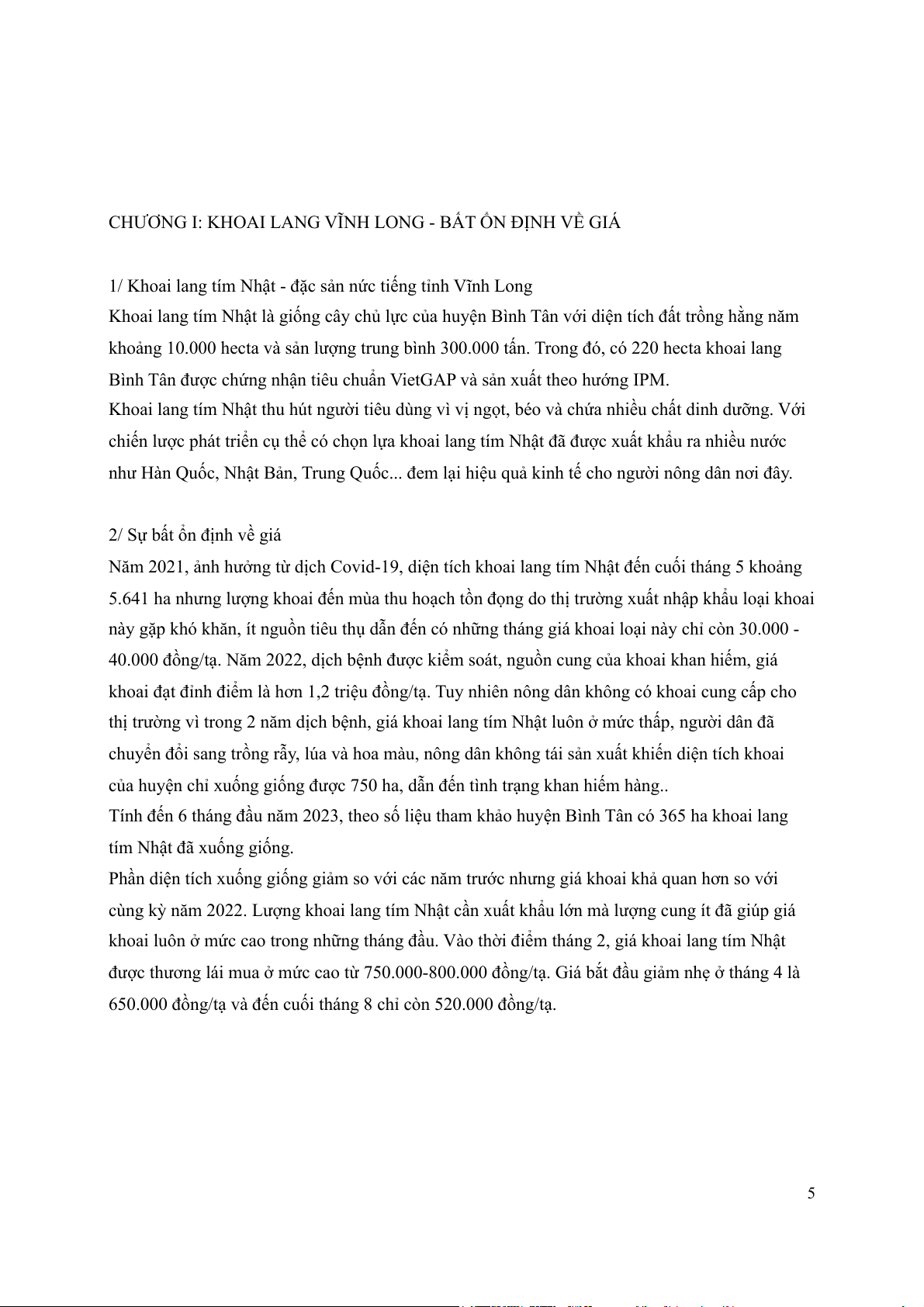 CHƯƠNG I: KHOAI LANG VĨNH LONG - BẤT ỔN ĐỊNH VỀ GIÁ