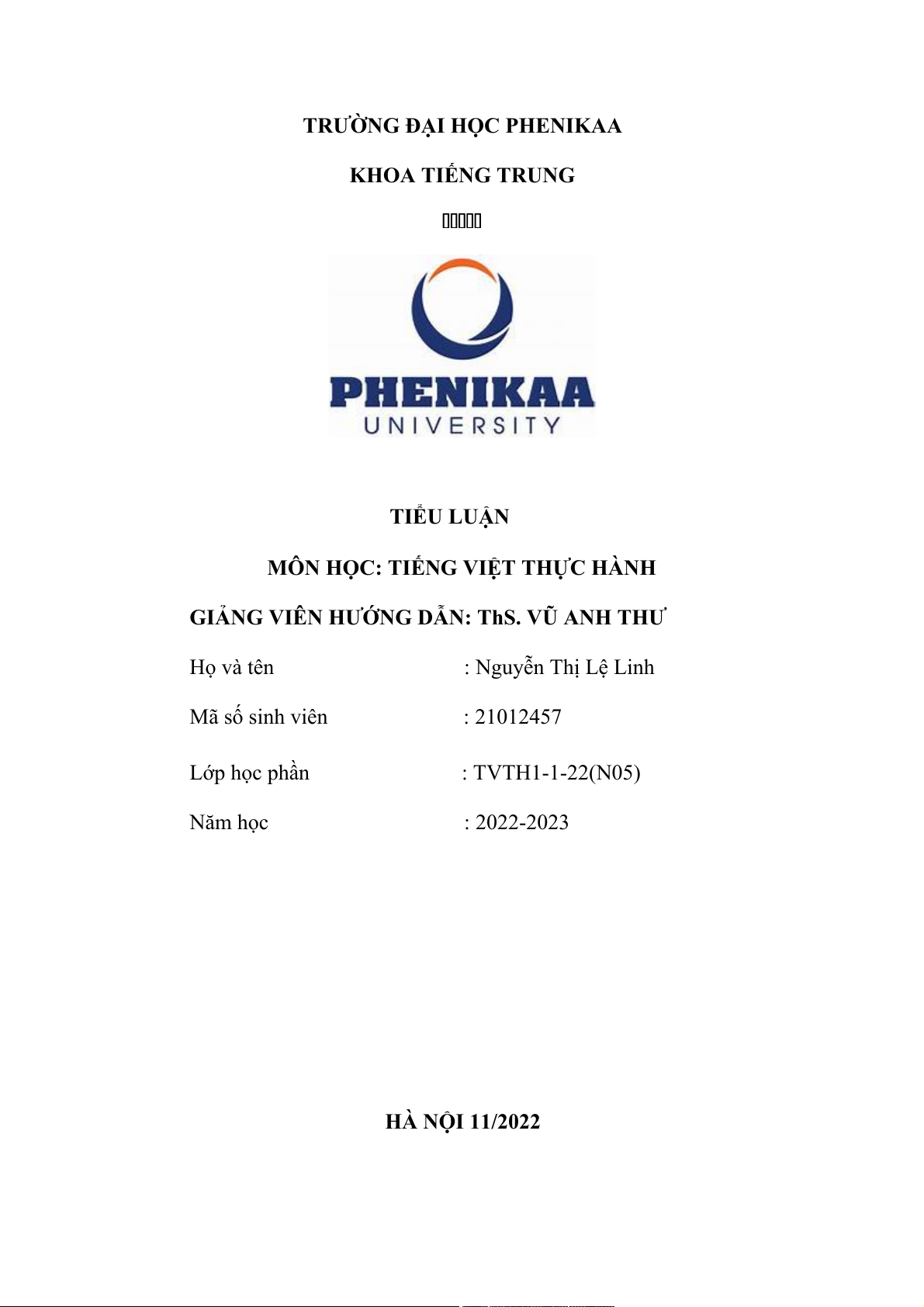 Họ và tên : Nguyễn Thị Lệ Linh Mã số sinh viên : 21012457