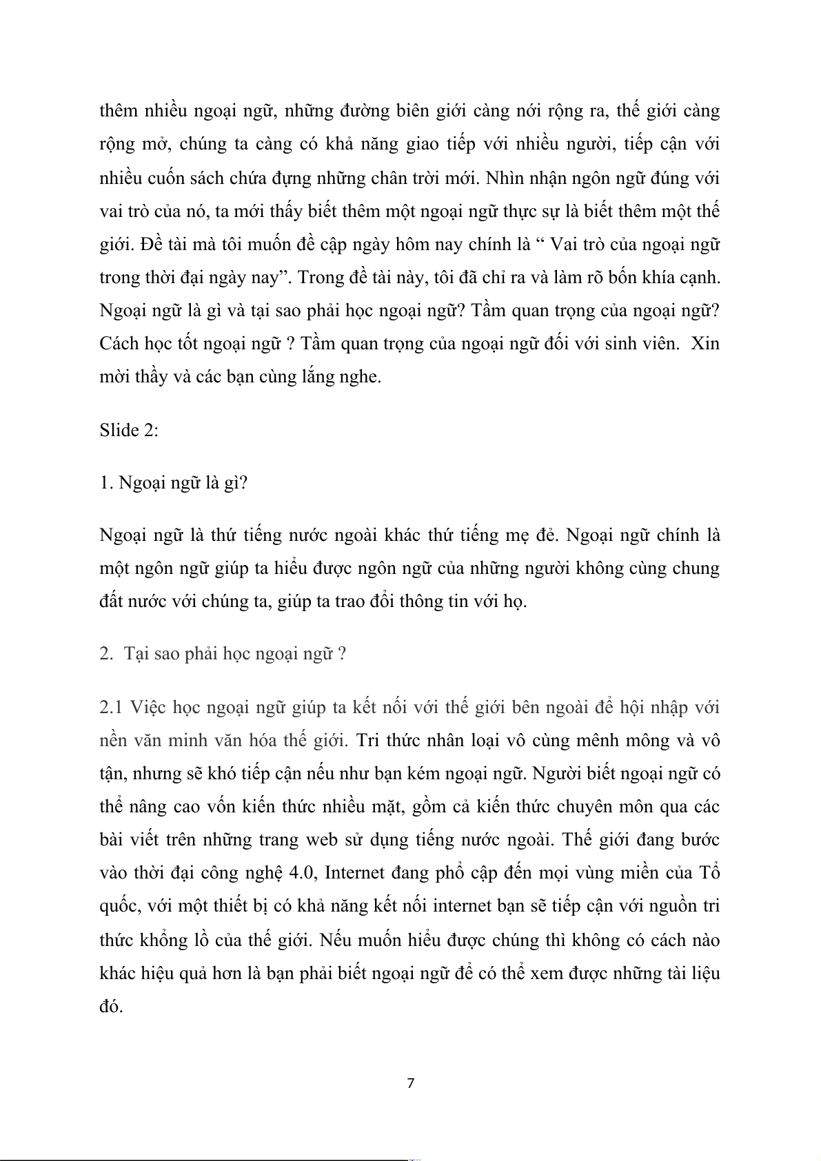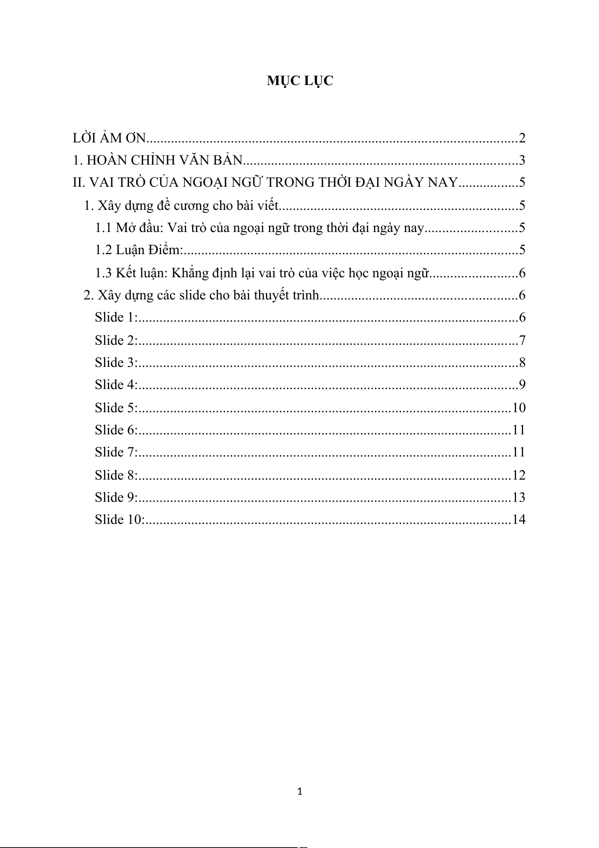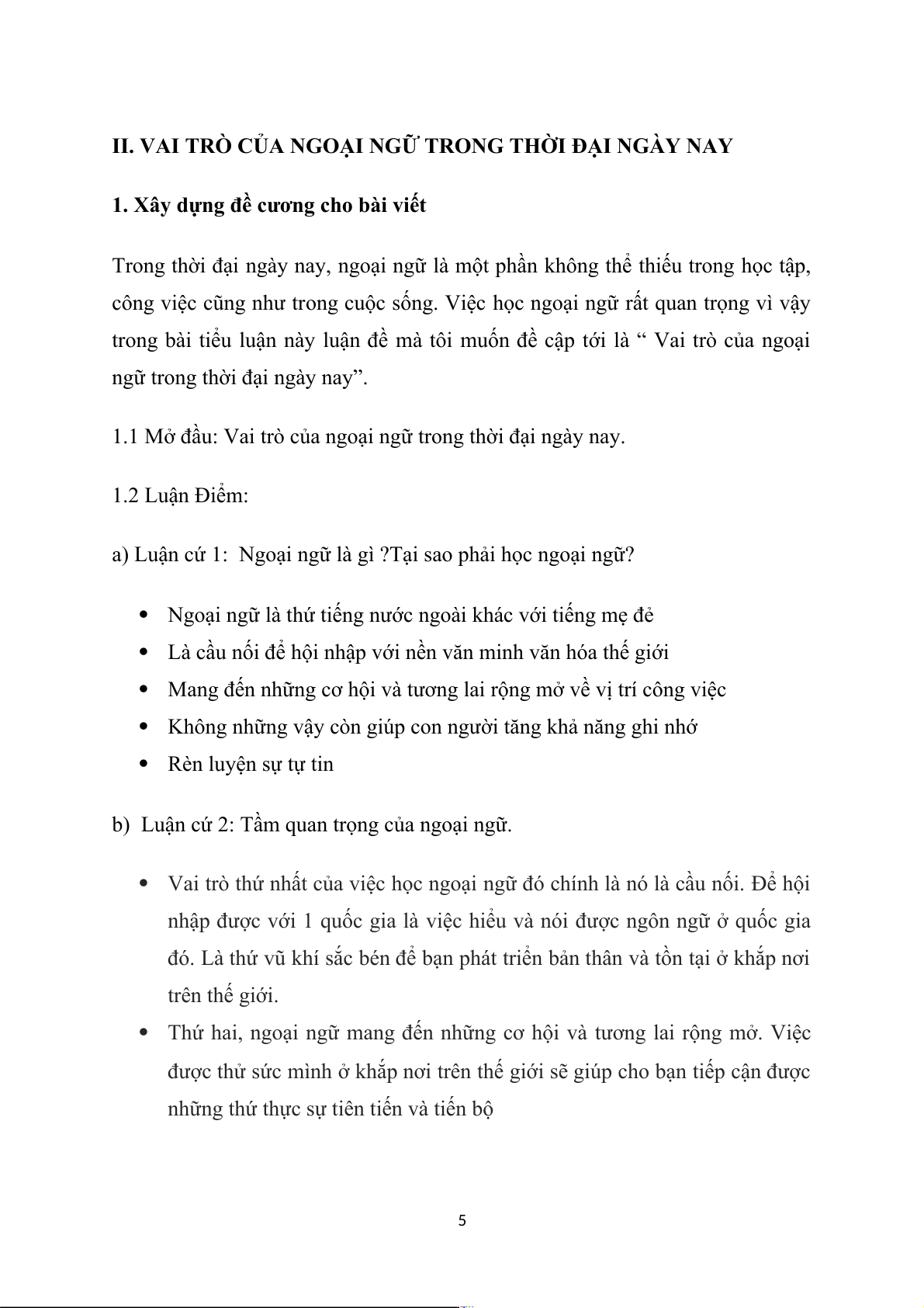 1.1 Mở đầu: Vai trò của ngoại ngữ trong thời đại ngày nay. 1.2 Luận Điểm: