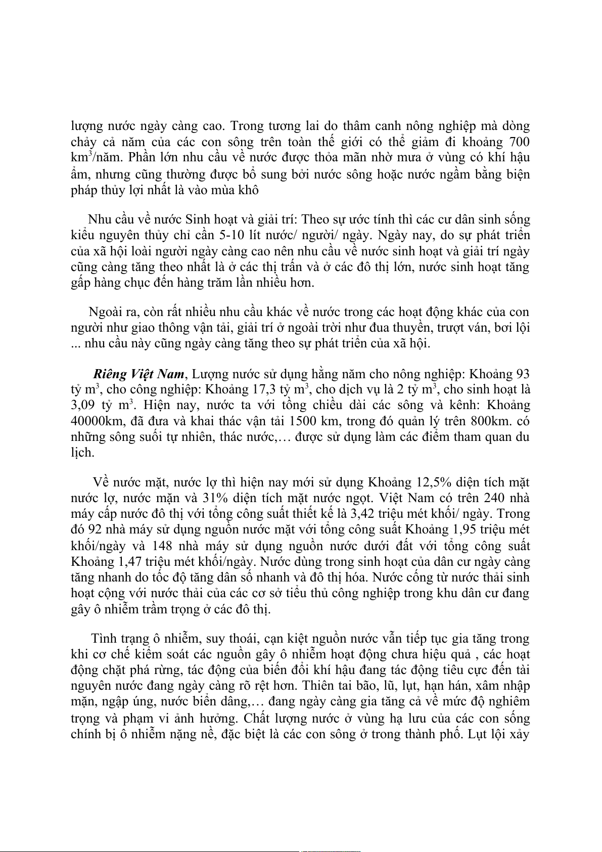 sinh hoạt. Tuy nhiên, nhu cầu nước sử dụng lại thay đổi tùy thuộc vào sự phát triển của mỗi quốc gia.