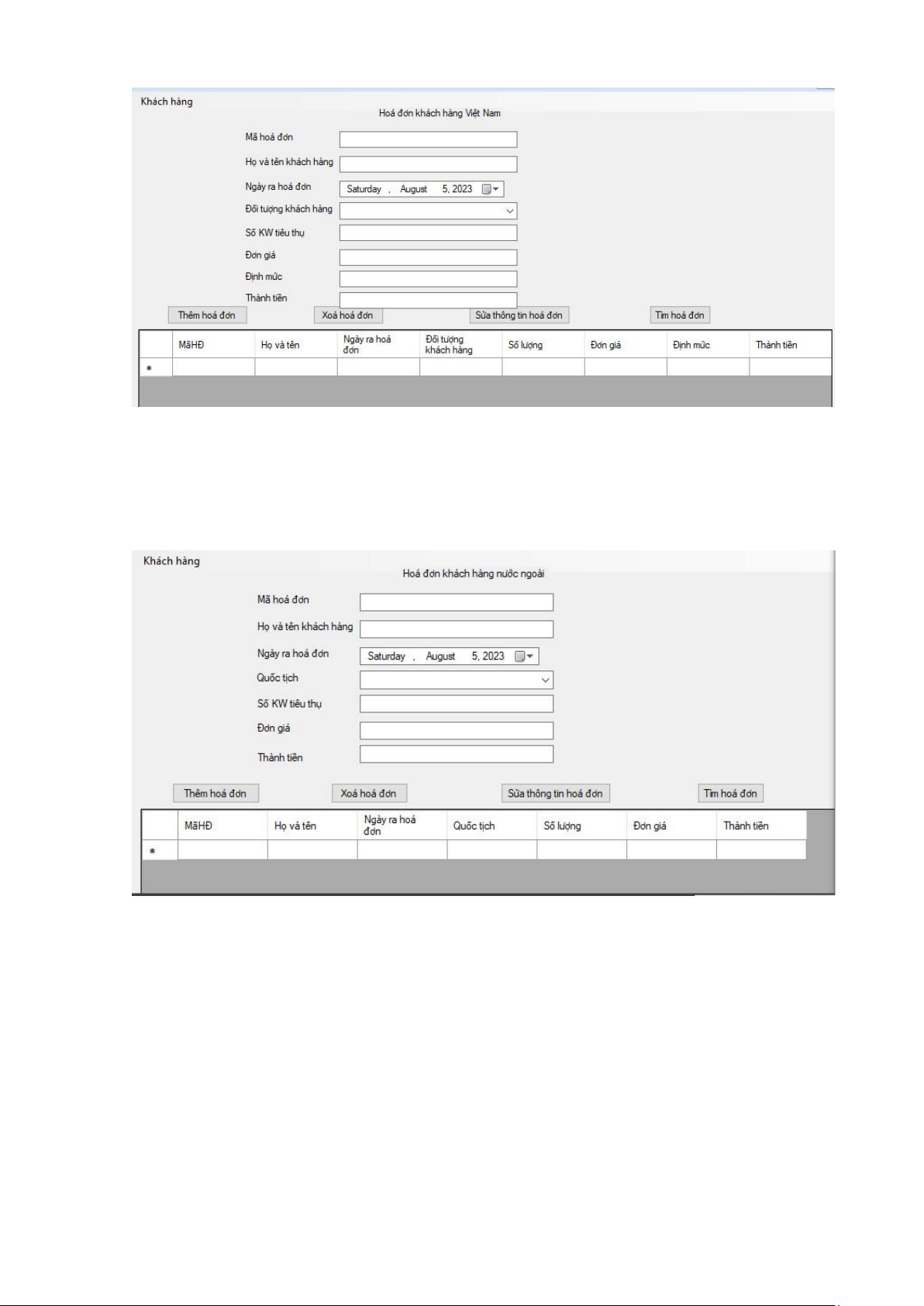 c) Giao diện danh sách hoá đơn tiền điện của khách hàng nước ngoài: