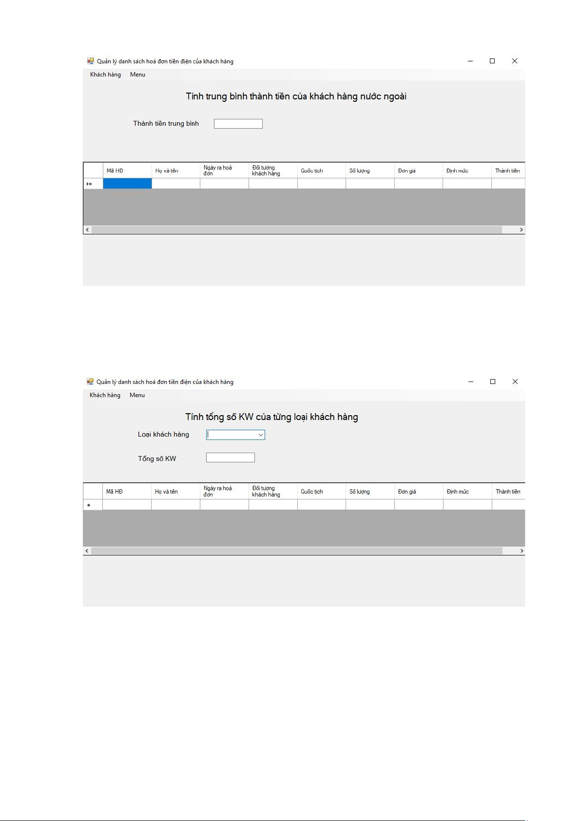 Trung bình tiền điện của khách hàng nước ngoài Khách hàng Việt Nam: + Họ và tên lOMoAR cPSD| 60755984 + Mã khách hàng + Số lượng tiêu thụ (kw) Khách hàng nước ngoài: + Họ và tên + Mã khách hàng