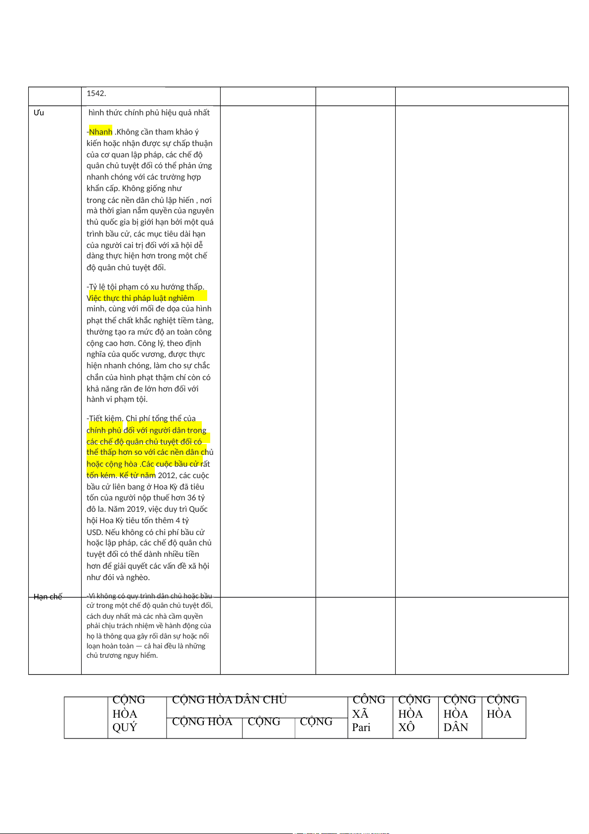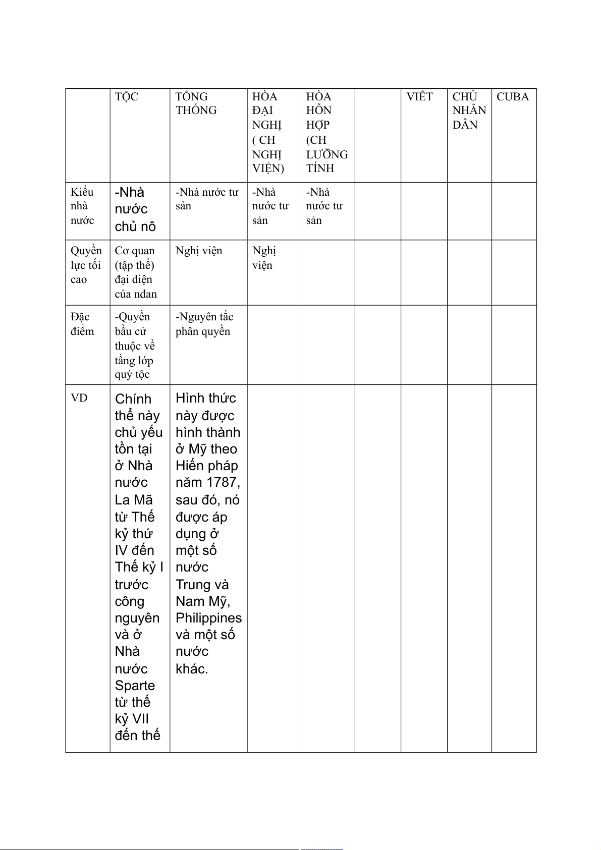 loạn hoàn toàn — cả hai đều là những chủ trương nguy hiểm. CỘNG CỘNG HÒA DÂN CHỦ CÔNG CỘNG CỘNG CỘNG HÒA XÃ HÒA HÒA HÒA QUÝ CỘNG HÒA CỘNG CỘNG Pari XÔ DÂN TỘC TỔNG HÒA HÒA VIẾT CHỦ CUBA THỐNG ĐẠI HỖN NHÂN NGHỊ HỢP DÂN ( CH (CH NGHỊ LƯỠNG VIỆN) TÍNH Kiểu -Nhà -Nhà nước tư -Nhà -Nhà nhà nước sản nước tư nước tư nước chủ nô sản sản Quyền Cơ quan Nghị viện Nghị lực tối (tập thể) viện cao đại diện của ndan Đặc -Quyền -Nguyên tắc điểm bầu cử phân quyền thuộc về tầng lớp quý tộc VD Chính Hình thức thể này này được chủ yếu hình thành tồn tại ở Mỹ theo ở Nhà Hiến pháp nước năm 1787, La Mã sau đó, nó từ Thế được áp kỷ thứ dụng ở IV đến một số Thế kỷ I nước trước Trung và công Nam Mỹ, nguyên Philippines và ở và một số Nhà nước nước khác. Sparte từ thế kỷ VII đến thế kỷ IV trước công nguyên.