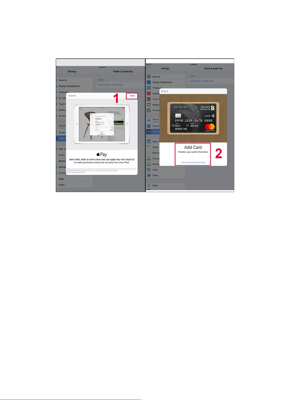 Để cài đặt Apple Pay trên iPad, bạn hãy làm tuần tự các bước sau: