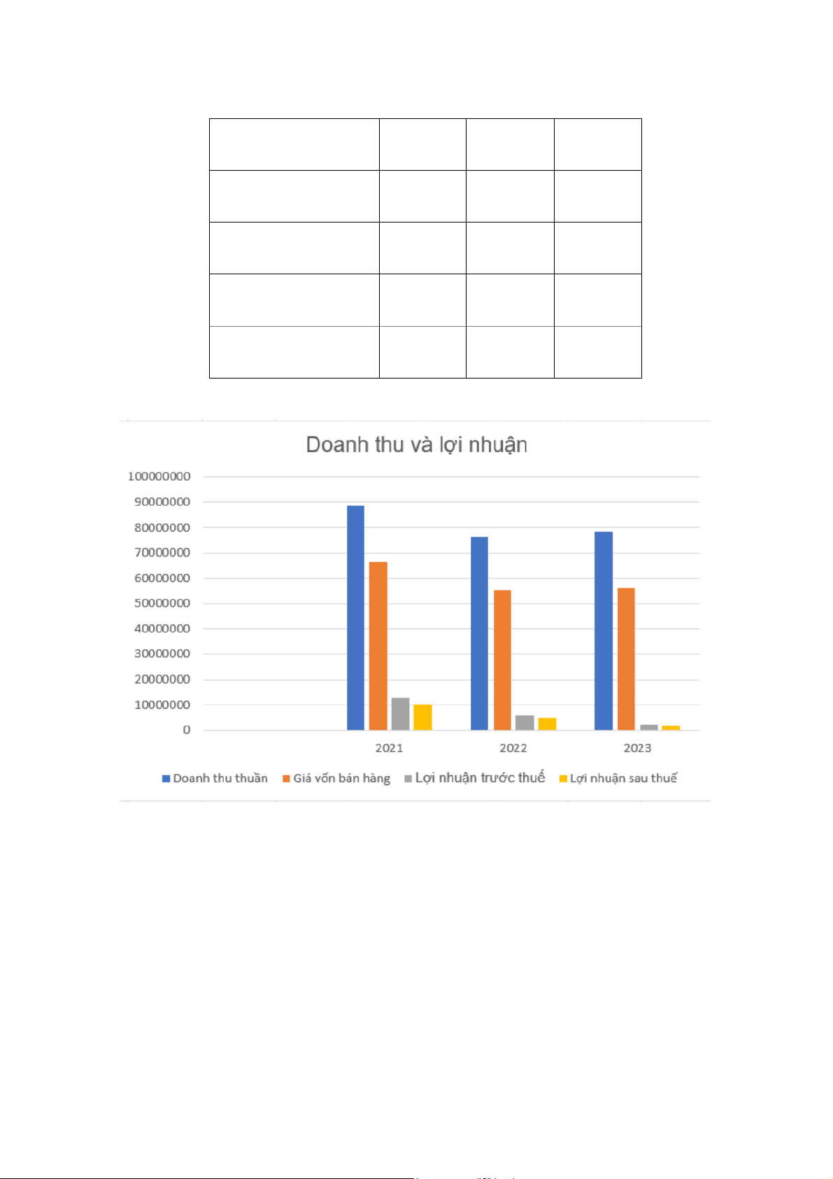 2.1.3. Kết quả kinh doanh giai đoạn 2021–2023 Chỉ tiêu 2021 2022 2023 Doanh thu thuần 88628767 76189225 78251619 Giá vốn bán hàng 66493966 55154201 56130507 Lợi nhuận trước thuế 12626726 5942980 2337408 Lợi nhuận sau thuế 10101381 4754384 1869927