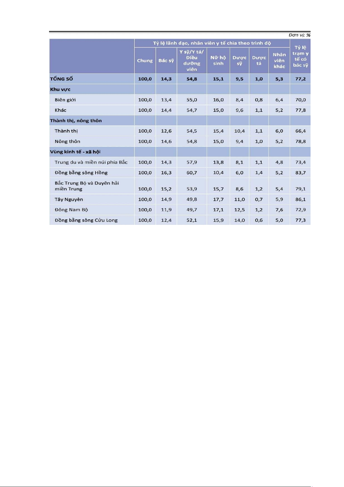 Tỷ lệ lãnh đạo, nhân viên y tế theo trình độ và tỷ lệ trạm y tế có bác sĩ theo