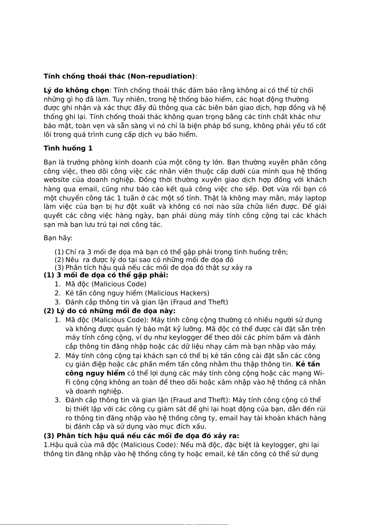 (1) Chỉ ra 3 mối đe dọa mà bạn có thể gặp phải trong tình huống trên;