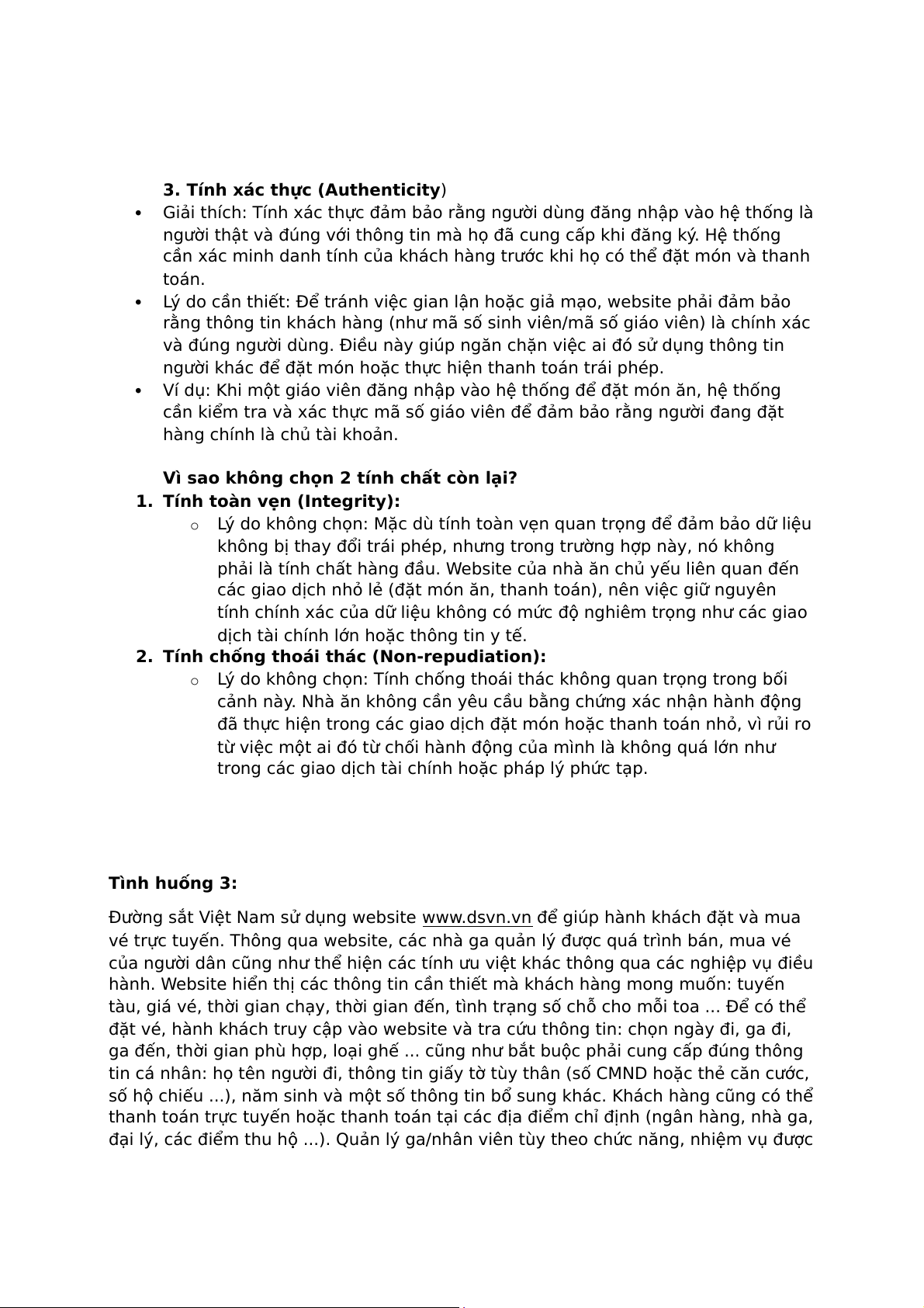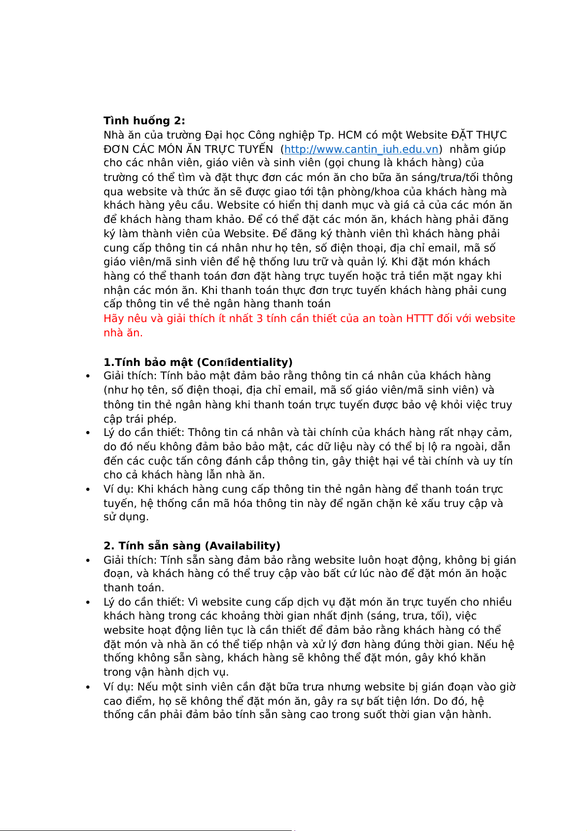 Hãy nêu và giải thích ít nhất 3 tính cần thiết của an toàn HTTT đối với website nhà ăn.